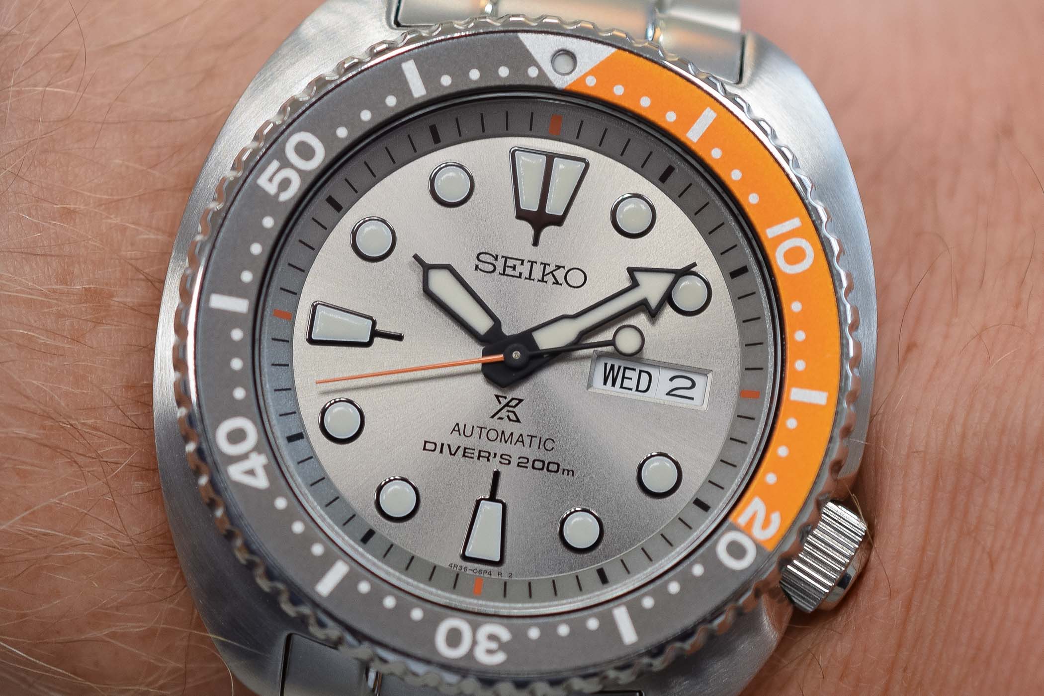 Both the Seiko Prospex Turtle “Dawn Grey” and the Seiko Prospex Samurai “Dawn Grey” come in a production run of 2,018 pieces and are available through Seiko dealers throughout Europe. The Prospex Turtle SRPD01K1 comes at a price of EUR 530, including a rubber strap with steel keeper and pin buckle clasp and in a special matching grey-and-orange box. The Prospex Samurai SRPD03K1 does not come with the extra strap and is slightly cheaper at EUR 470.