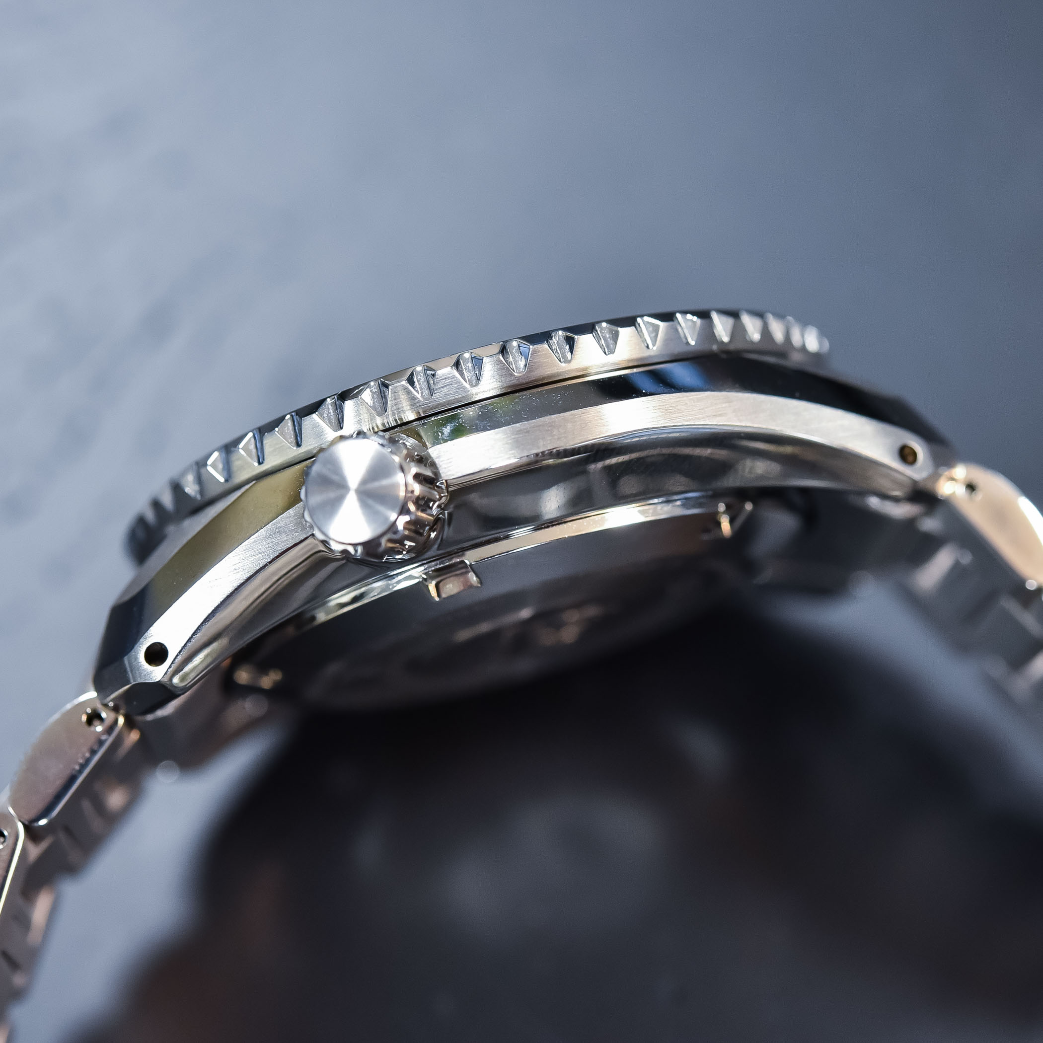The addition of a traveller’s complication doesn’t affect the diving credentials of this watch. The fact that Seiko chose to keep a 60-minute scale on the bezel, and not a 24-hour GMT scale, shows that it is meant to be a diver’s watch first, with the addition of a GMT function. A relatively rare sight at Seiko, this unidirectional bezel is equipped with a ceramic insert – here in glossy black with a white track. With its solid steel back and screw-down crown, it retains a comfortable 200m water-resistance and the dial is protected by a domed and bevelled sapphire crystal with an anti-reflective coating.