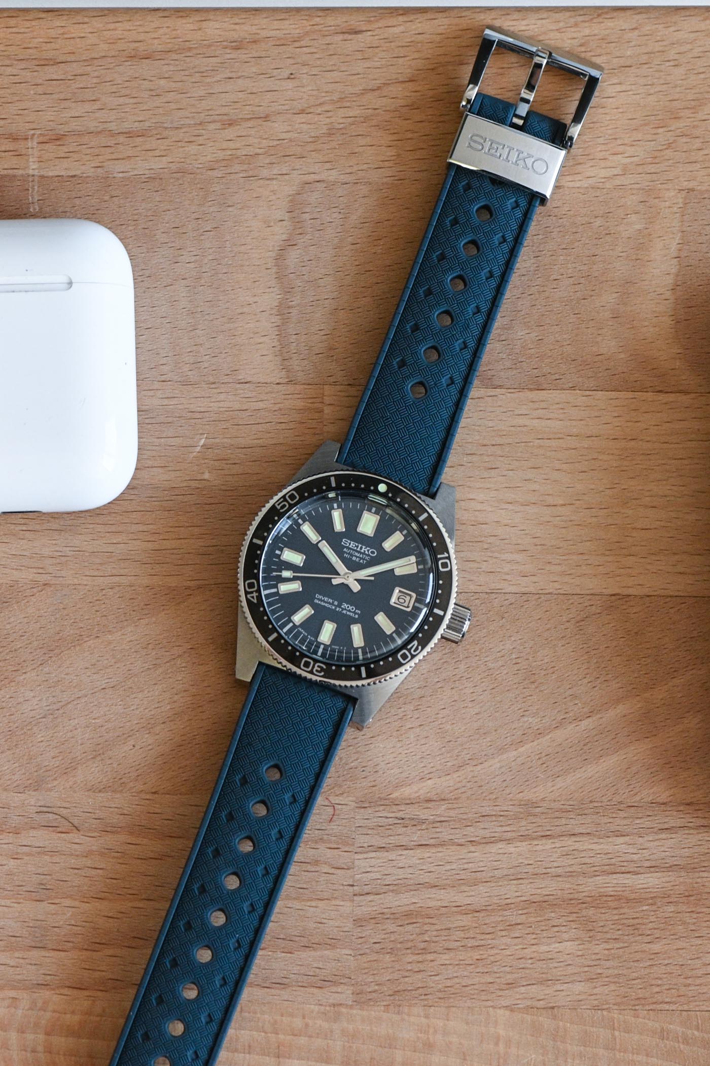 The new strap is still made of silicone, but now with a matte finish, a thinner profile and a tropic-like pattern, which suits the 1960s style of the watch. It comes in blue to match the dial and features a steel pin buckle as well as a brushed and bevelled steel holder, engraved with Seiko. The strap feels comfortable straight out of the box.
