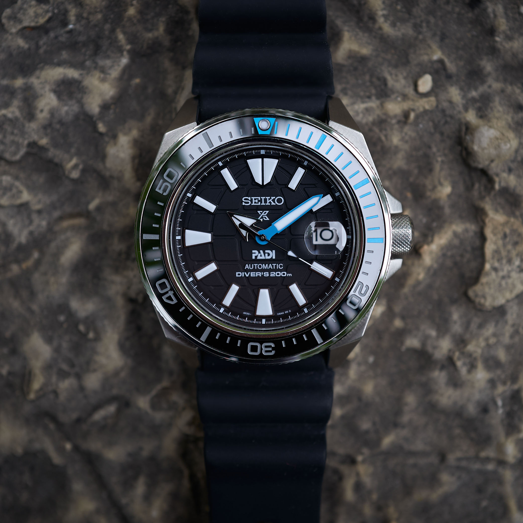 One of a pair of Seiko/PADI watches released for 2021, the PADI King Samurai SRPG21K1 is a 43mm stainless steel sports watch. Nicknamed the Samurai by the watch community because the original, released in 2004, had a pair of sword hands (clever folks on Seiko forums back in the day), it also features a very angular case design, which if you look hard enough, could be inspired by a samurai helmet, maybe? Regardless, it’s a cool design and very fitting for a workhorse diver, in my opinion. The first thing you will notice about these new PADI releases is the lack of the tell-tale blue and red colour scheme that has been present in all releases until now. Historically they have had either matte black or PADI-blue dials and some combination of blue, red and black on the bezels and hands. This year they have gone with a black dial embossed with the PADI globe logo and touches of light blue on the bezel and hands. It’s much more understated reference and a nice reset of the PADI theme. It’s also a show of Seiko’s company-wide love of a textured dial.