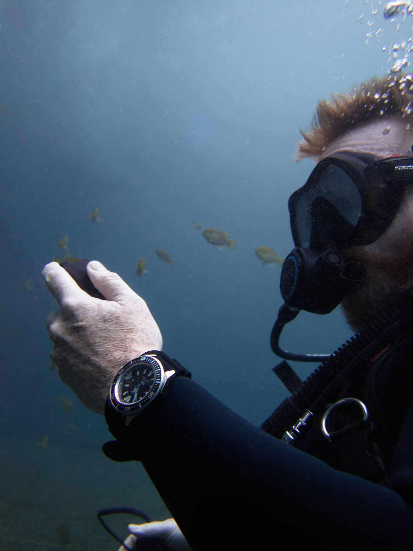 As I mentioned before, the silicone strap fits comfortably and securely over the wetsuit, and the subdued colour scheme blends right into the dive kit like a good piece of gear should. Once in the water, setting the bezel is one of the last things I do before submerging, and herein lies my one complaint about the Samurai. The bezel on this watch was quite difficult to turn and not in a good way. Sometimes bezels feel solid but still usable, which gives a feeling of security knowing they wowon’te easy to accidentally turn. This one was simply hard to turn, and in between clicks, felt very mushy, like it was difficult to find the next click, and had to go around a few times to get it in the right place, which was no small feat. It’s not the end of the world, and once set, it stays firmly in place, but it’s worth mentioning. I’m not sure if this is the case on all Samurais, so definitely do your own research, but a quick Google search sees a few similar comments on the forums.
