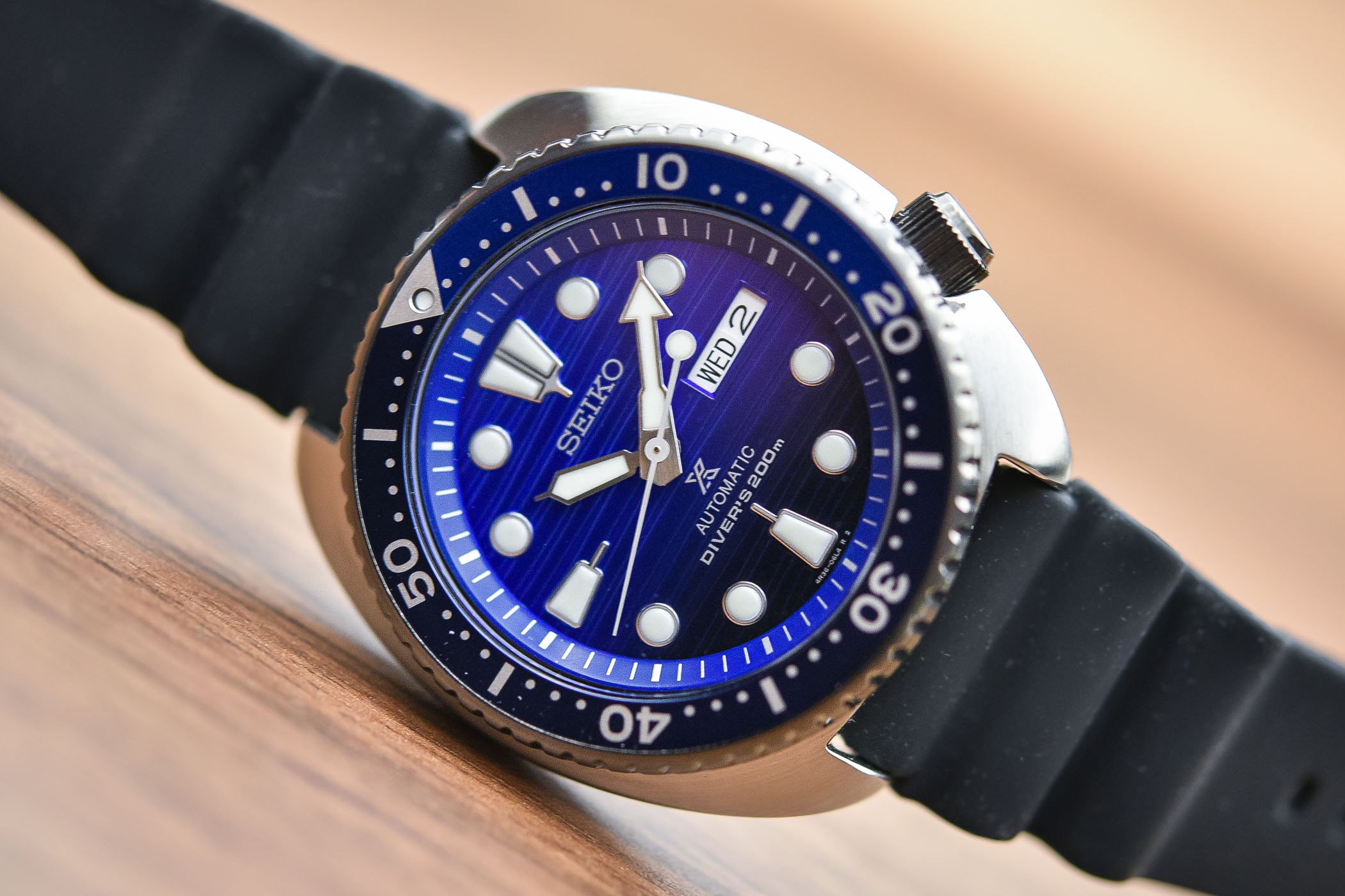 This new dial, easily one of the boldest created by Seiko on the recent Prospex Divers, is combined for the occasion with restrained, low-key silver hands and indices. No red accents, no fake patina, just simple, efficient silver hands and white luminescent material – better for contrast. The second update on this Turtle “Save The Ocean” SRPC91K1 is the bezel’s insert, which is coloured in bright blue (first 20 minutes of the scale) and abyss blue (rest of the scale), thus matching the dial. Finally, the crown and the bezel itself are coated in black – another distinctive feature to make this special edition unique in the collection.