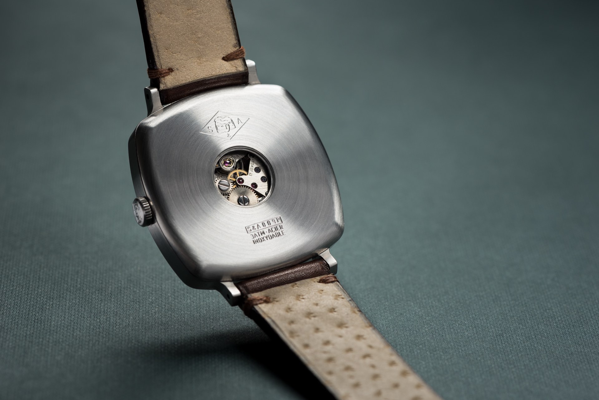 All cases are brushed stainless steel and 8mm in height, with the round case being 37mm in diameter while the others are 37mm vertically. The designs are very simple and dare I say, timeless. They’re water resistant to only 30m, so avoid swimming and diving, with sapphire crystals on the front and small exhibition “eyecups” on the back. You’ll get a cool but incomplete view of the vintage movements. The crown is stamped with their three-faced logo and a unique manufacturing number will be stamped on the back.