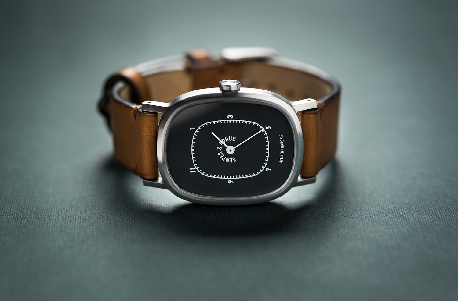 The dials come in black, white or tan, with various printing arrangements among them. All are simple with common fonts and everything is printed, avoiding applied indices and complications. In fact, all three designs are time-only with not even a seconds hand. In my eye, they have a 1960s retro vibe, and two commonalities are the company’s name wrapped around the top half of the central hands and ATELIER FRANCAIS printed at the bottom. The dial colours have a matte finish and legibility seems excellent across the board.