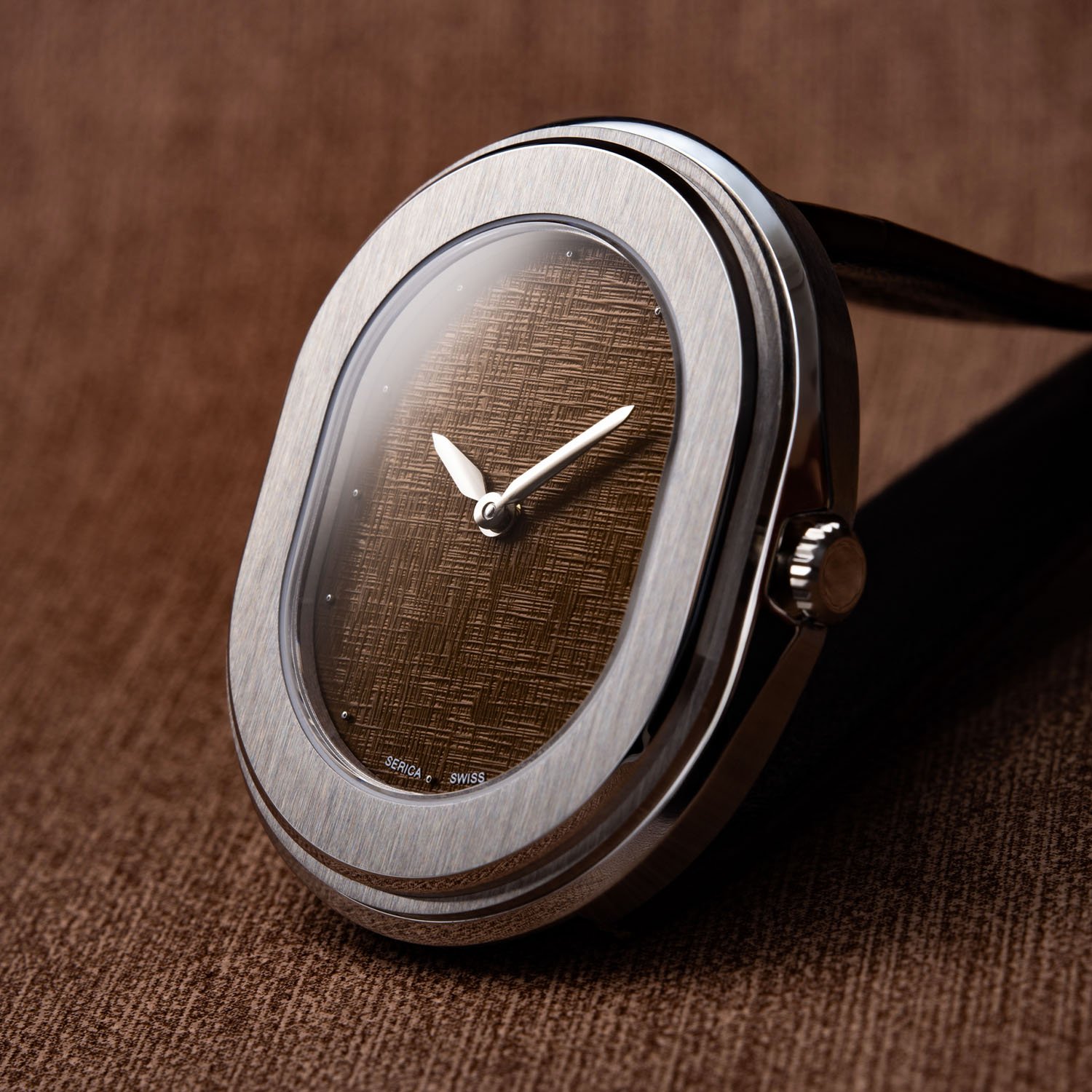 The case retains the same proportions and no-lug construction, at 35mm in width and 41mm in length, and 8.2mm thick. The case is compact, with a broad dial opening and a gentle curvature that hugs the wrist. The geometry does more than look good. Serica’s sandwich construction uses long through-bolts that run inside the bezel to compress gaskets, helping achieve 100m water-resistance in a slim automatic watch. The flanks are vertically brushed, the bezel is lightly polished, and the transitions are sharp. A non-screw-down crown is acceptable for a city-first watch that still tolerates real life.