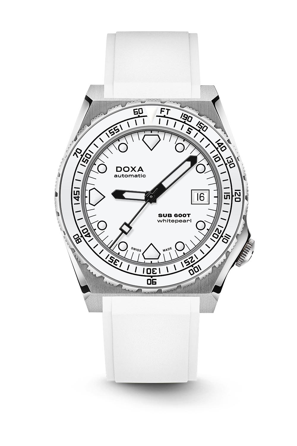 Doxa has embraced the colour white for the summer of 2022 with a series of Whitepearl watches across its collections. With five new releases all with stark white dials, we take a closer look at the Sub 600T Whitepearl. The Sub 600T was reintroduced last year in a titanium limited edition first, and a complete collection of 24 references in steel later. This rugged dive watch comes with a chunky steel case, white dial, steel or white ceramic bezel and rubber strap or steel bracelet. So, even within the SUB 600T Whitepearl sub-collection, you can choose from four different combinations, priced between EUR 1,350 and EUR 1,490. To us, the go-to look would be an all-white model with a white dial (obviously), a white ceramic bezel, and a white rubber strap.
