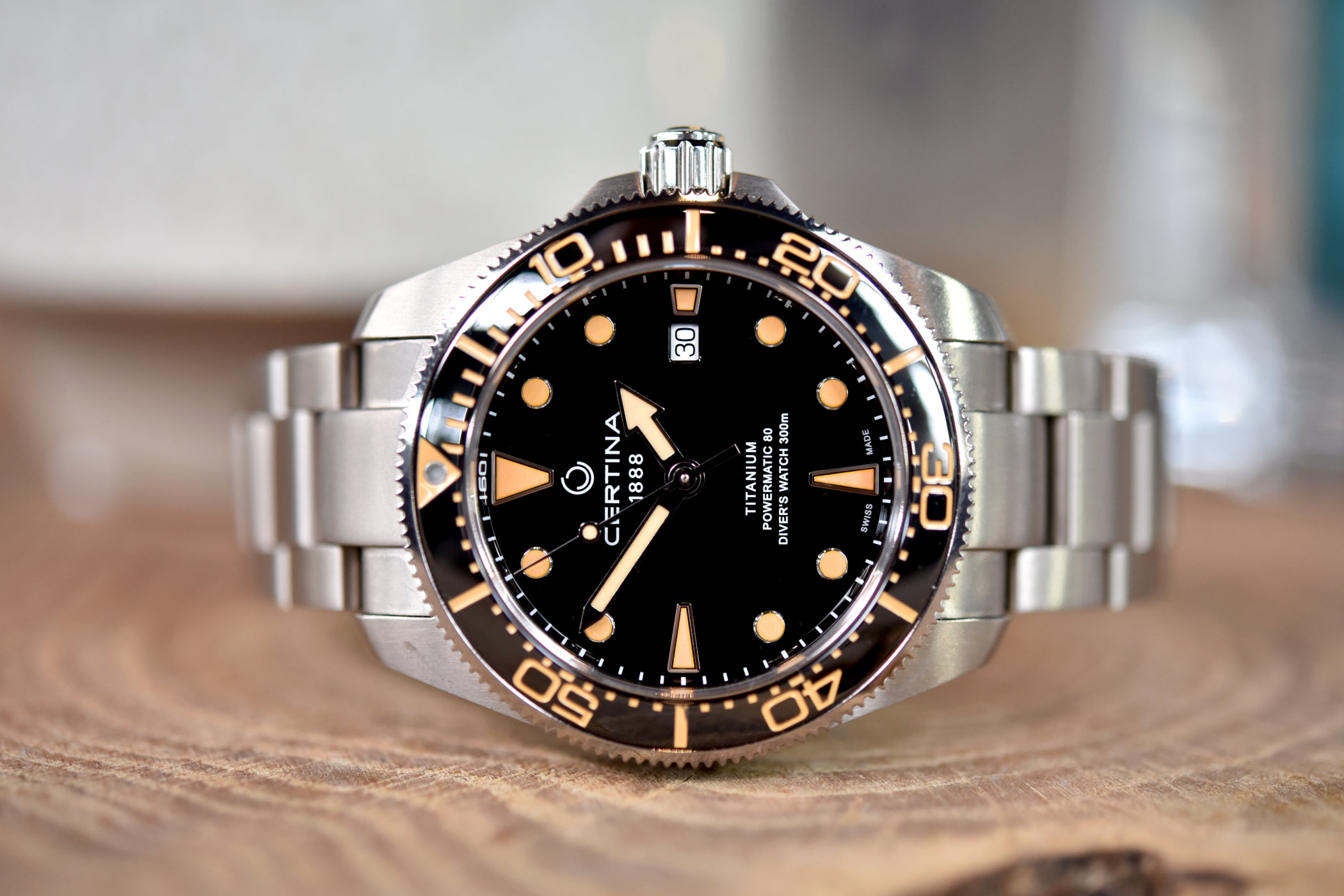 Next up is another diver, which is surely not much of a surprise. We’ve recently spent some time with the quite impressive Certina DS Action Diver Titanium. This retro-modern dive watch comes in full titanium, with a glossy black dial and beige indices and hands. With its full titanium case, it feels extremely comfortable on the wrist. Certina gives you a choice between a full titanium bracelet, but we feel the black and beige NATO strap (made from #tide ocean materials) is the better look. Inside ticks Swatch Group’s Powermatic 80 movement with a healthy 80 hours of power reserve. And the price? A very reasonable EUR 1,020 (NATO strap) or EUR 1,115 (titanium bracelet).