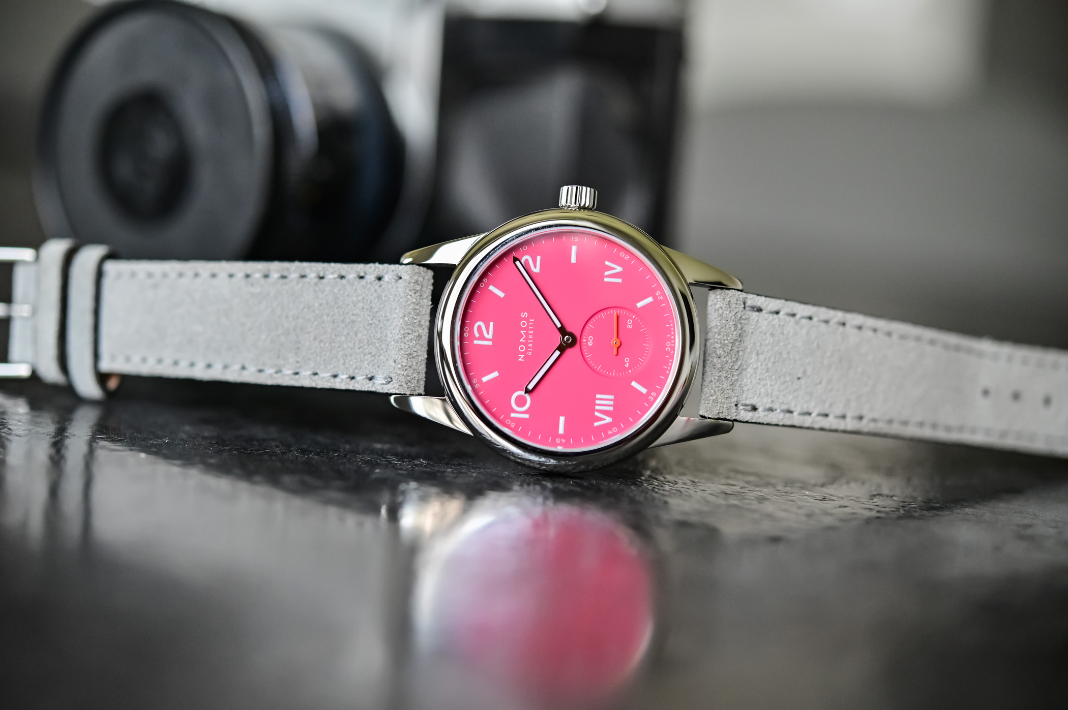 Quick Facts – 36mm or 38.5mm x 8.2mm or 8.5mm – stainless steel case, polished – domed sapphire crystal – closed caseback – 100m water-resistant – Deep Pink California dial – Arabic numerals & Roman Numerals – Super-LumiNova elements – sword-style hour and minute hands – recessed small seconds sub-dial with neon orange hand – Nomos Alpha calibre, in-house – manual winding – 17 jewels – 21,600vph – 43h power reserve – blued screws, Côtes de Genève, perlage – light grey velour strap with steel pin buckle – EUR 1,100 (36mm) or EUR 1,200 (38.5mm)