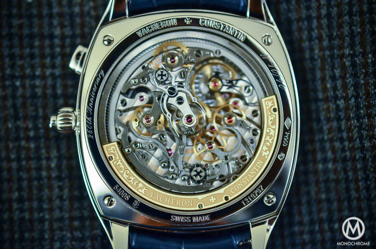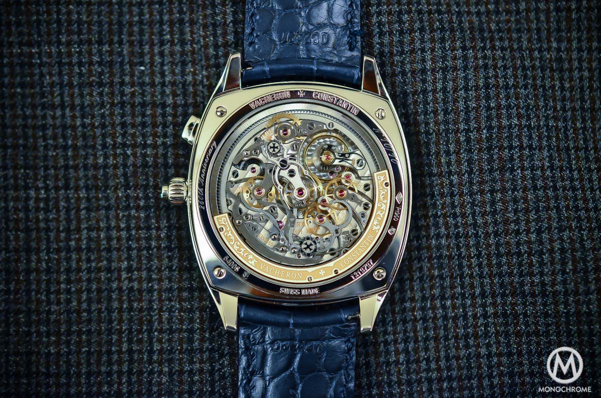 All of these elements are visible through the caseback. We can admire two column-wheels – one for the chronograph and one for the split-second mechanism, linked to the brake system in the very middle of the movement. Both column-wheels are elegantly adorned with the Malte Cross, Vacheron Constantin’s logo. Finishings are extremely nice, with straight graining on the levers, beveled angles on the bridges and levers and circular graining on the main plate. All parts are lavishly executed, as required by the Hallmark of Geneva.