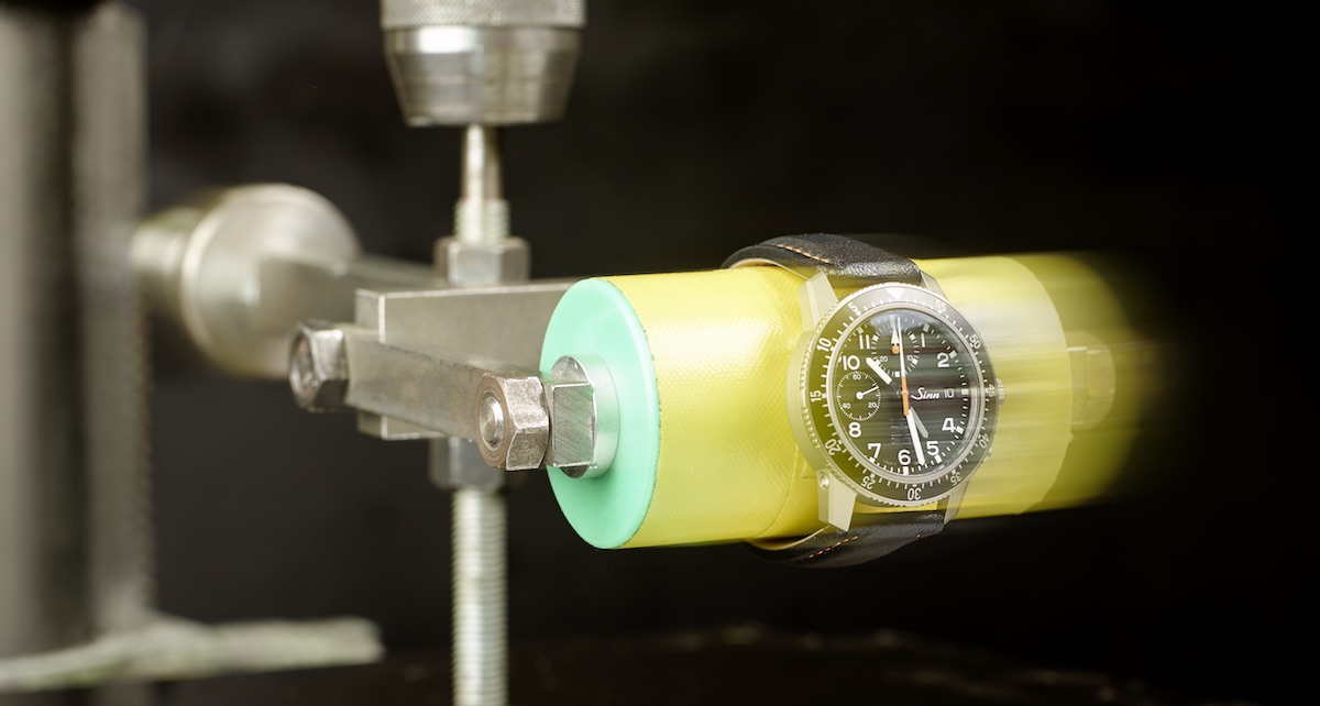 The Sinn R500 relies on a Valjoux 7750 automatic chronograph movement beating at a frequency of 28,800vph and providing the watch with a 42-hour power reserve. Anti-magnetic to German DIN 8309 standards (ISO 764) of 4,800 A/m, the movement incorporates a stop-seconds function.