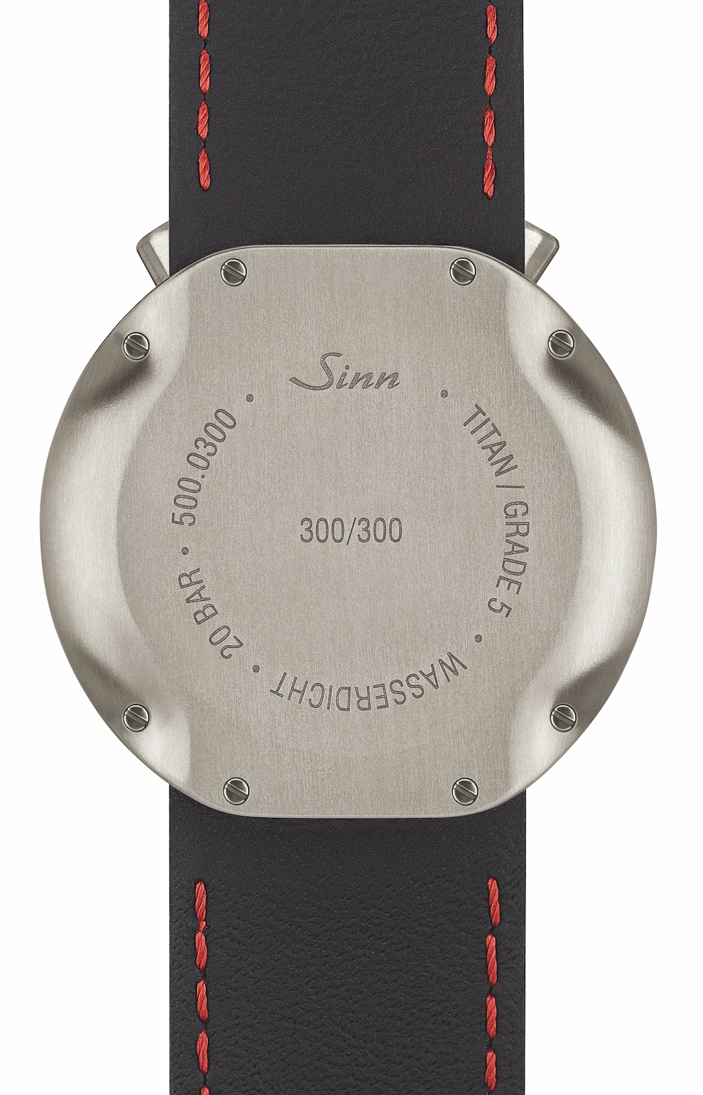 The Sinn R500 comes with a sporty black cowhide strap with red stitching integrated into the case and features the classic aerated pattern (holes) associated with the world of car racing.