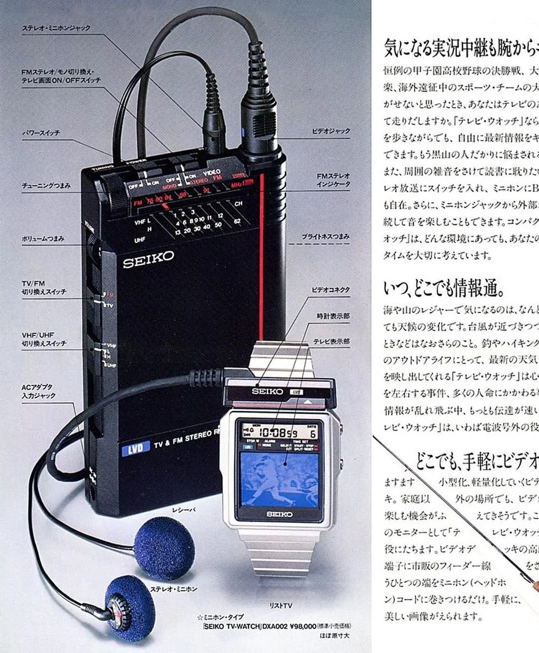 Unfortunately, there were drawbacks to the design, starting with poor battery life and a TV screen that lacked good contrast and definition, not to mention the very small size. It was certainly watchable, but you needed to be a tech enthusiast to really enjoy it. Also, it required a separate tuner box about the size of a cassette Walkman that attached to the case via a six-pin connector, along with wired headphones. The trick was to put the tuner in your pocket and run the wire through your sleeve to the watch, essentially hiding the bulky yet necessary component to create the illusion of a fully autonomous watch. The tuner used two AA batteries that also powered the TV screen, but viewing time was limited to just a few hours. If you wanted more, an optional AC adapter kept things lit up indefinitely (as long as you were near an outlet). The tuner picked up analog VHF and UHF TV signals, along with FM radio bands, which was downright Dick Tracy cool for the early 1980s.