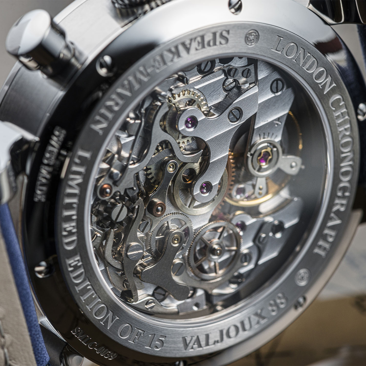 The movement components used for the London Chronograph were stored in a safe for many years and it took time for Speake-Marin to source working pieces. The movement was reassembled, checked and decorated at Speake-Marin’s workshop near La Chaux-de-Fonds. The refined architecture of this Valjoux 88 column-wheel chronograph can be appreciated through the sapphire caseback, including the decorative flourishes applied to the movement by Speake-Marin. Decorated with Côtes de Genève, other details like the polished chamfers on the bridges and the levers attest to the refined level of finishings. Distinguished by its nine-pillar column-wheel structure, the 13 ligne movement beats at a frequency of 18,000vph and can store up to 48 hours of power reserve.