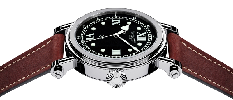 The dial of the new Spirit Mark 2 features numerals, hour and minute markers, a railroad chapter ring, the Speake-Marin name, the ‘signature’ topping tool motif and the Spirit title all in white Super-LumiNova moulded. That contrasts superbly against the light-absorbing matte black. This matches very well with the military style dial and also the brown leather strap perfectly supports this.