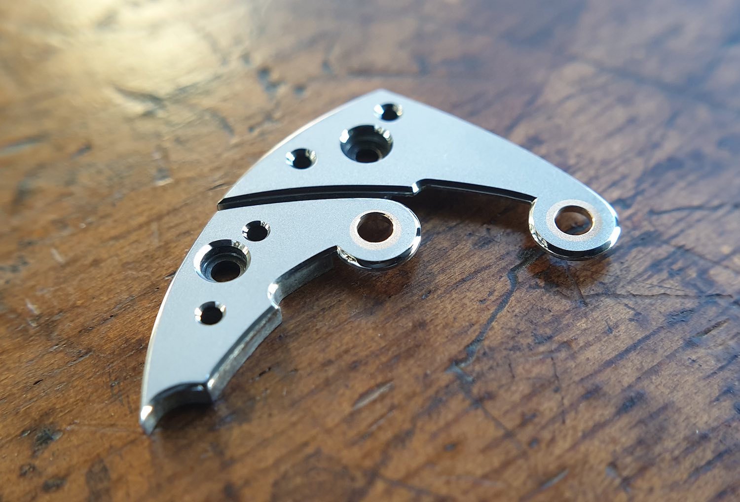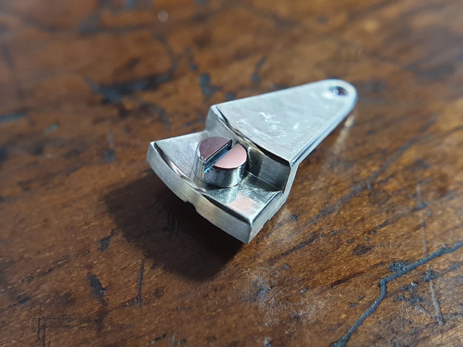 The plate and bridges are fashioned out of maillechort (also known as German silver), with the exception of the two steel bridges found on the movement side. Théo Auffret used the escapement of a LeCoultre 409 movement, as well as the barrel and a few others parts of a Peseux 260.