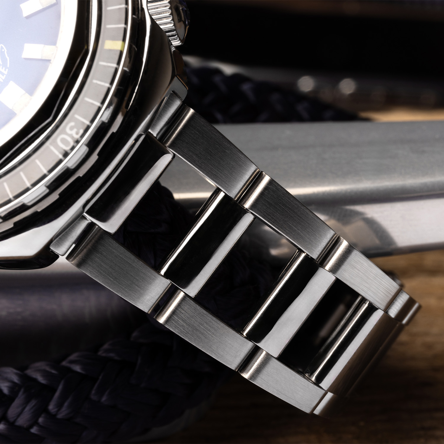 Inside the case, the ETA 2772 found in the original models has been replaced by a Sellita SW200, a tried-and-tested Swiss movement known to be a great alternative to the ETA 2824. Used in its élaboré version, it runs at 4Hz and stores about 38 hours of power reserve. Another, very cool historical touch is the return of a period-correct stainless steel bracelet with open “ladder-style” links, closed by a modern folding clasp. A very nice touch that adds a lot of character to this already nice, vintage-oriented watch.
