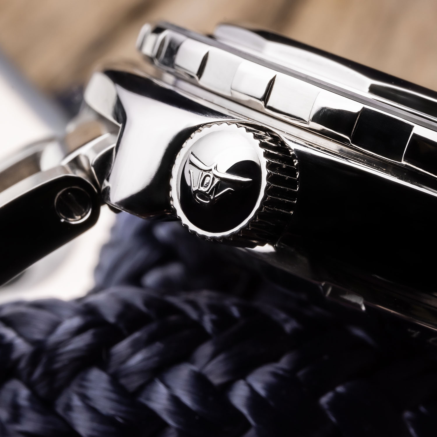 The bezel, unlike the historic bakelite version, now features a single-color sapphire glass insert for enhanced durability. Just like in the 1960s, the bezel is equipped with a sophisticated “push-to-release” system – a safety mechanism that allows it to unlock in both directions only with perpendicular pressure, ensuring maximum security even in the event of accidental impacts. The dial is protected by a flat AR-coated sapphire crystal and the back is a solid steel element screwed to the case.