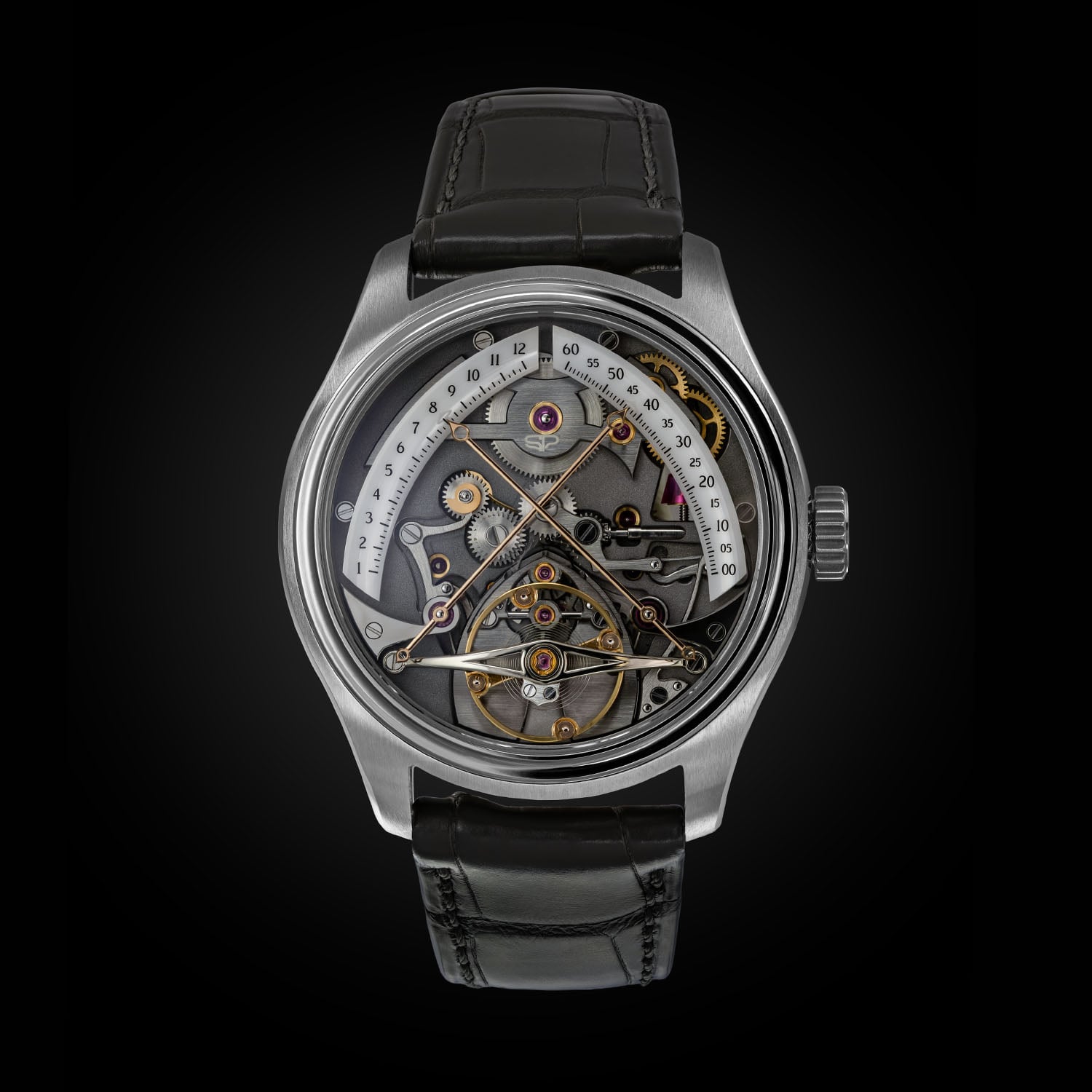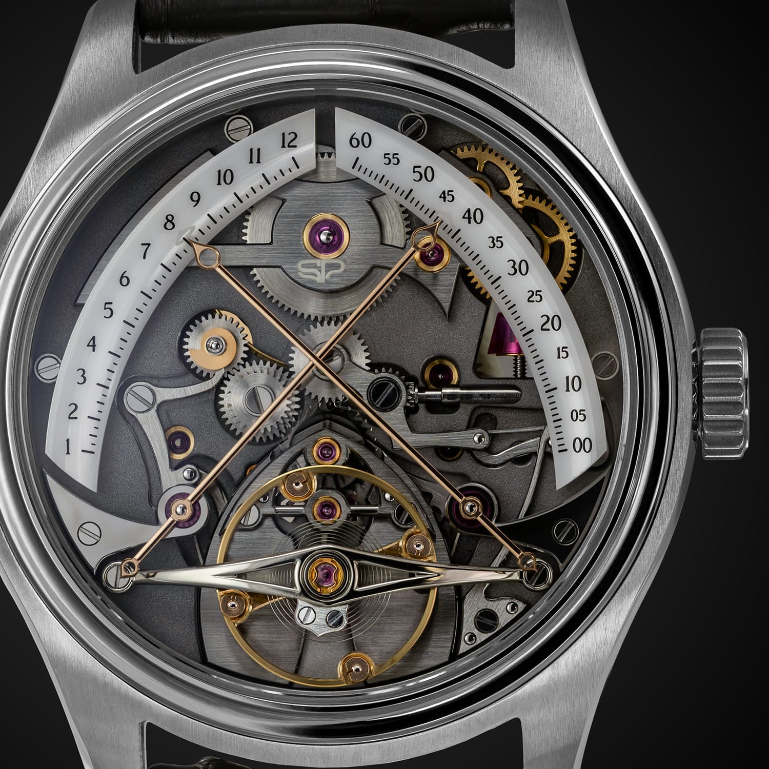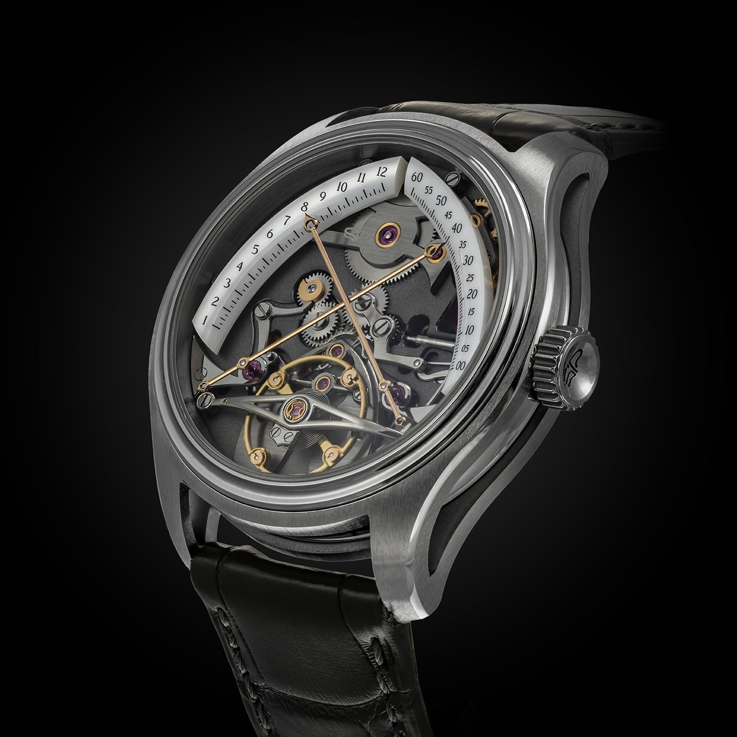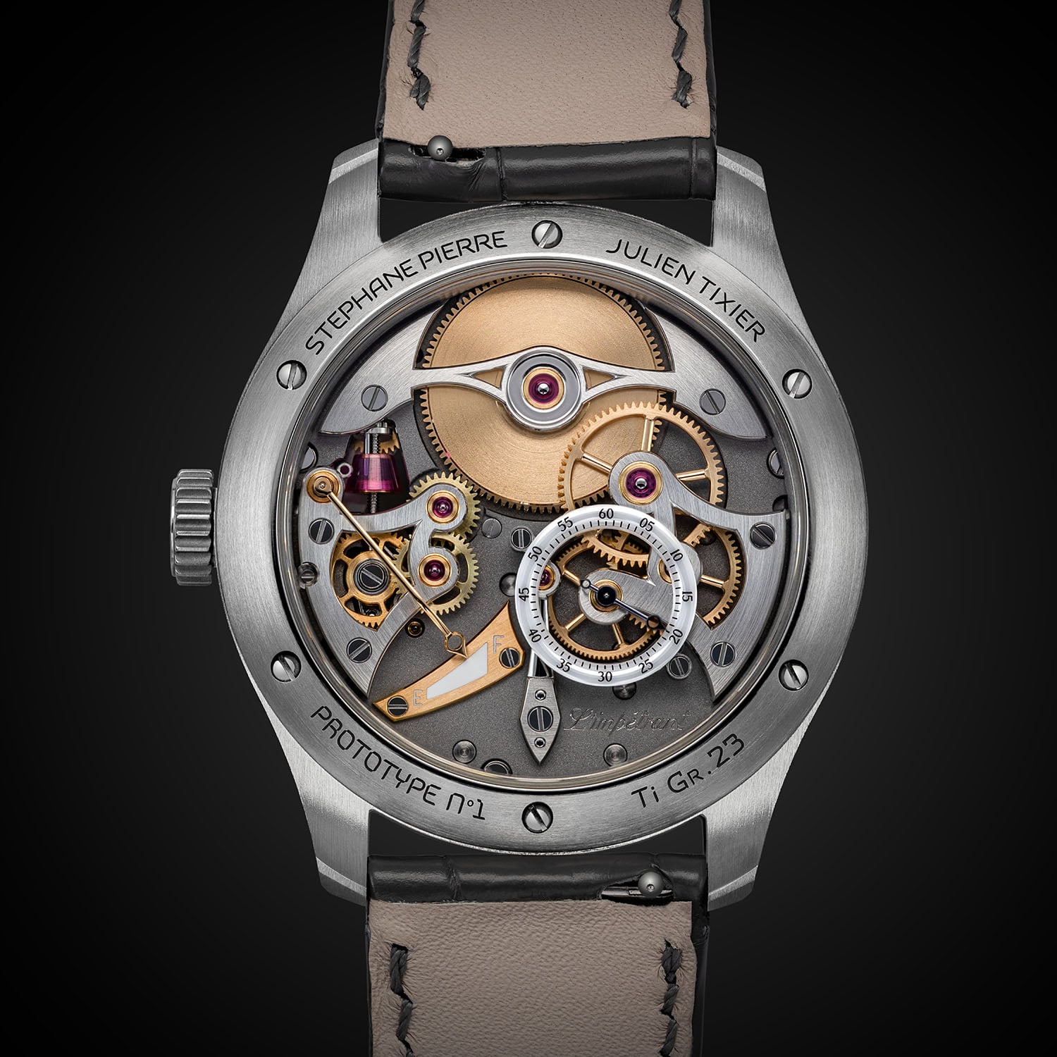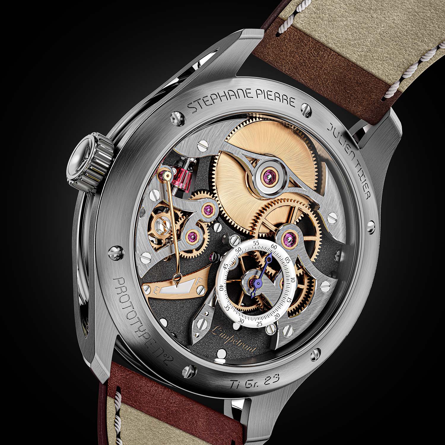 The case of the Stéphane Pierre L’Impétrant is crafted in Grade 23 titanium, with polished concave surfaces and satin-brushed finishes. It measures 39mm in diameter and 10.8mm thick, 12.2 mm including the sapphire crystal. The 27-component construction is complex, with lugs machined as separate elements assembled around a central unit. A limited “souscription” series of 15 pieces introduces a combination of zirconium and rose gold, ahead of the 50-piece titanium production run.