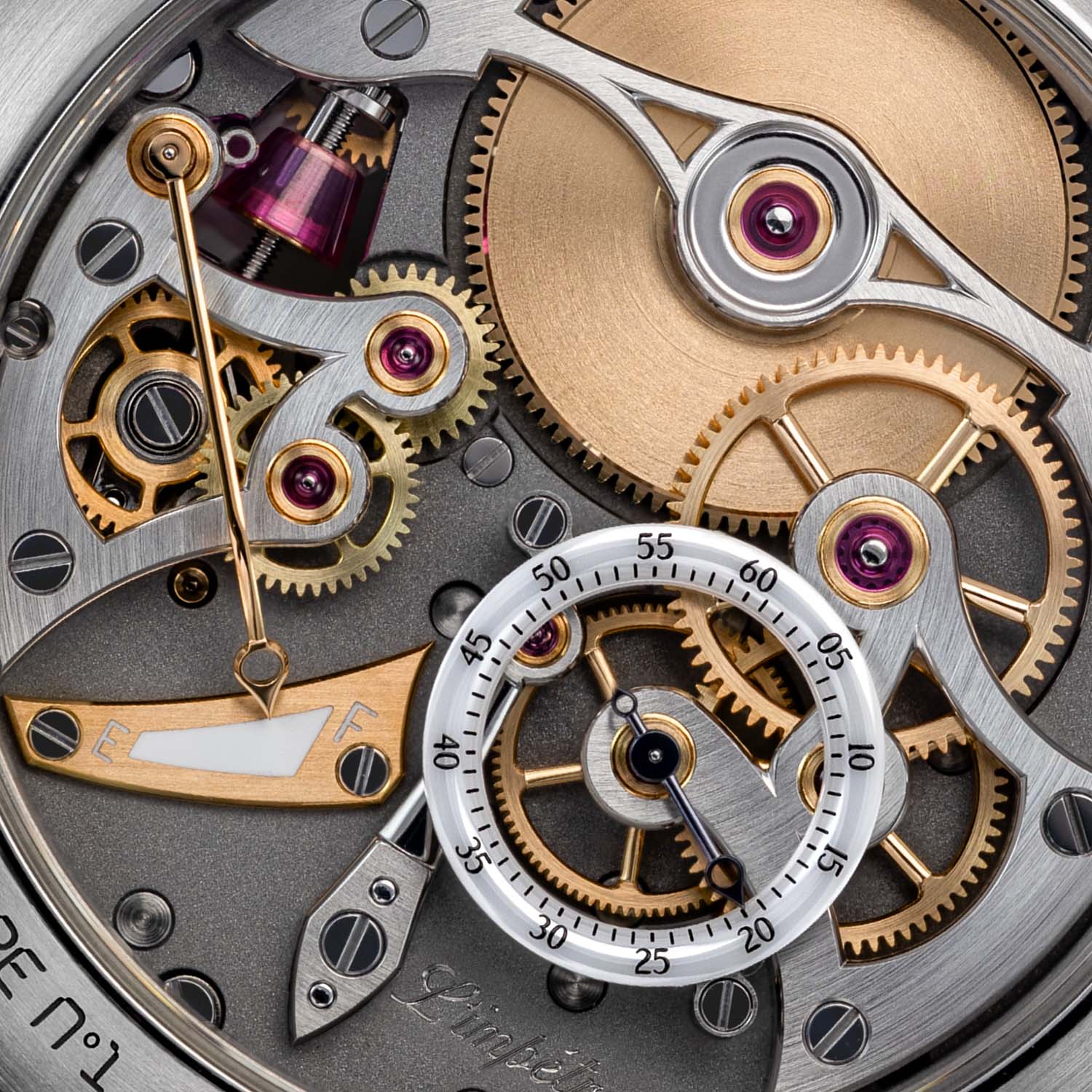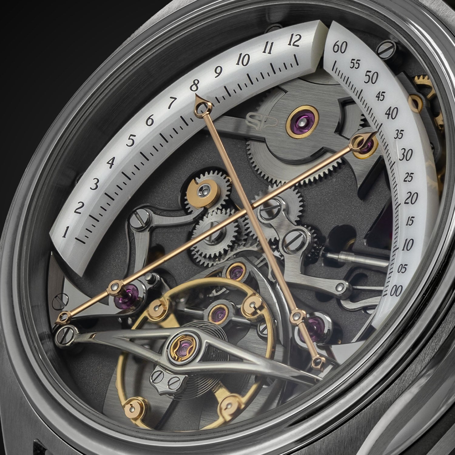 The watch is powered by a movement developed internally, specifically for this project. The movement with ruthenium-treated bridges and a rose gold-toned barrel runs at 21,600 vibrations/hour. It offers a 70-hour power reserve, indicated by a vertical red sapphire cone, visible from the front, and a hand on the back. Also on the back, small seconds are indicated by a heat-blued steel hand on a ring with markings and numerals.