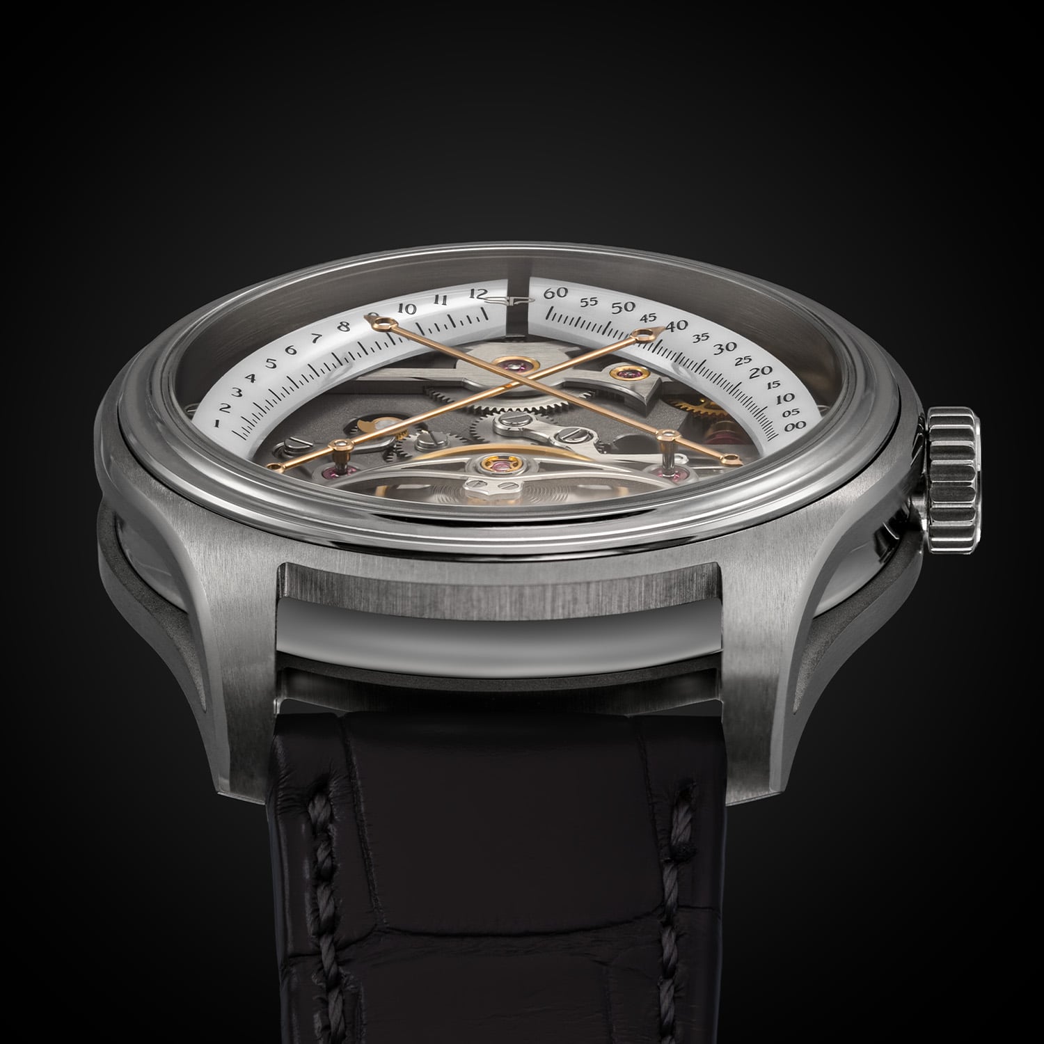 The dial-side is captivatingly technical as the watch is built around an idea of time displayed through a double retrograde system for hours and minutes. Two 20mm long rose-gold treated titanium hands with polished bevels were engineered to withstand repeated shocks from the retrograde mechanism. They sweep across curved white ceramic scales that work as subdials, before snapping back to zero in a coordinated motion. The minutes complete their arc every 60 minutes, triggering the hour hand to jump forward, culminating in a shared retrograde reset every 12 hours. At 6 o’clock, the large 11.5mm balance wheel with a traditional Breguet overcoil is a focal point, elevated and deliberately exposed.