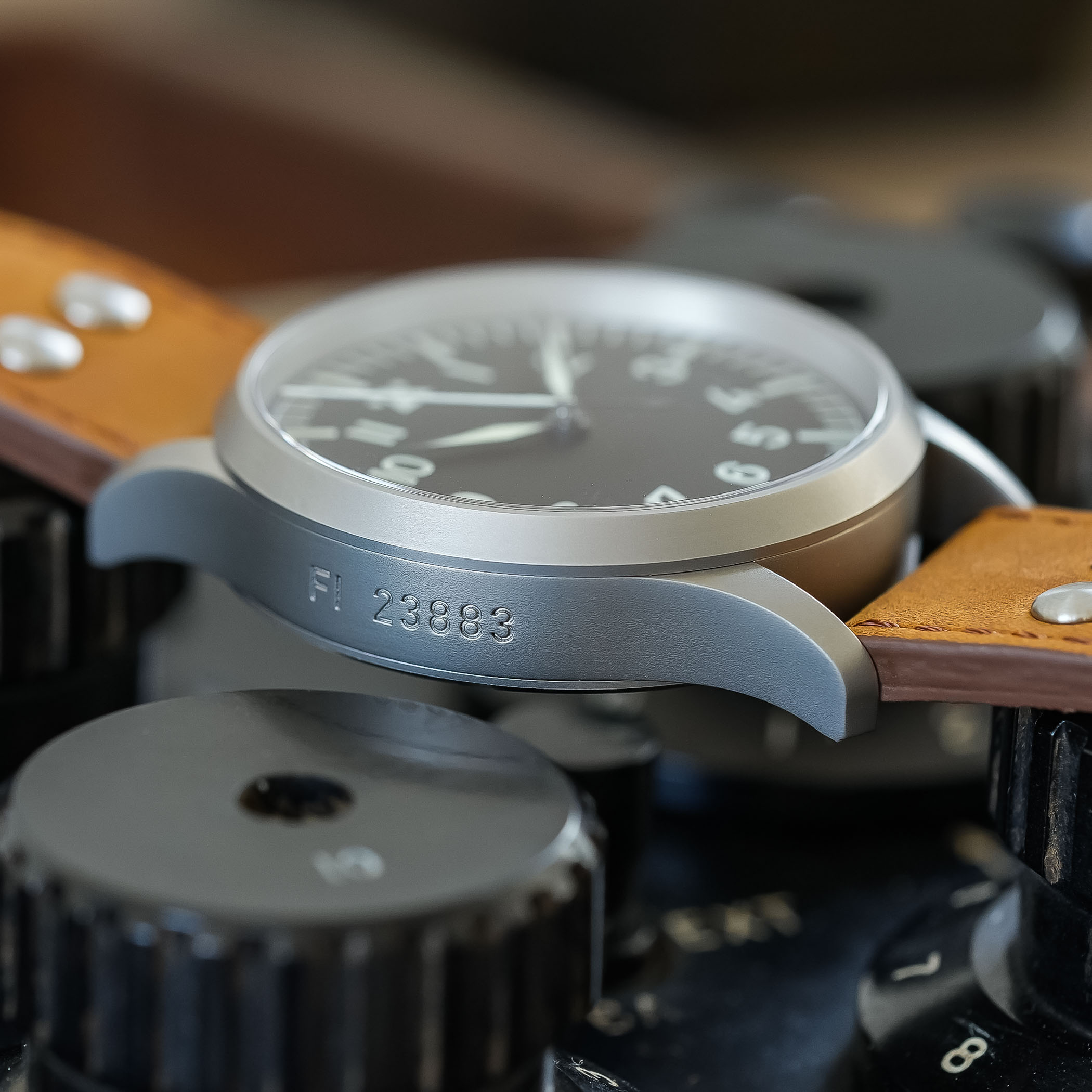 The historical B-Uhr pilot’s watches came in oversized cases to be worn over a flight jacket in the early days of aviation. That has been sized down over time as the need for such watches dwindled, but pilot’s watches today are still considered to need a good size to work best. As such, for its new Flieger Original, Stowa has opted for a 42mm wide by 13.5mm tall stainless steel case. To adhere to its tool-like roots, the case has been bead-blasted to an extra-matte finish. On top and the back, a sapphire crystal keeps things protected from outside threats, and the flat onion-style crown can be used to easily wind and set the watch. The “FI 23883” on the left side of the case is optional, even though historically relevant.