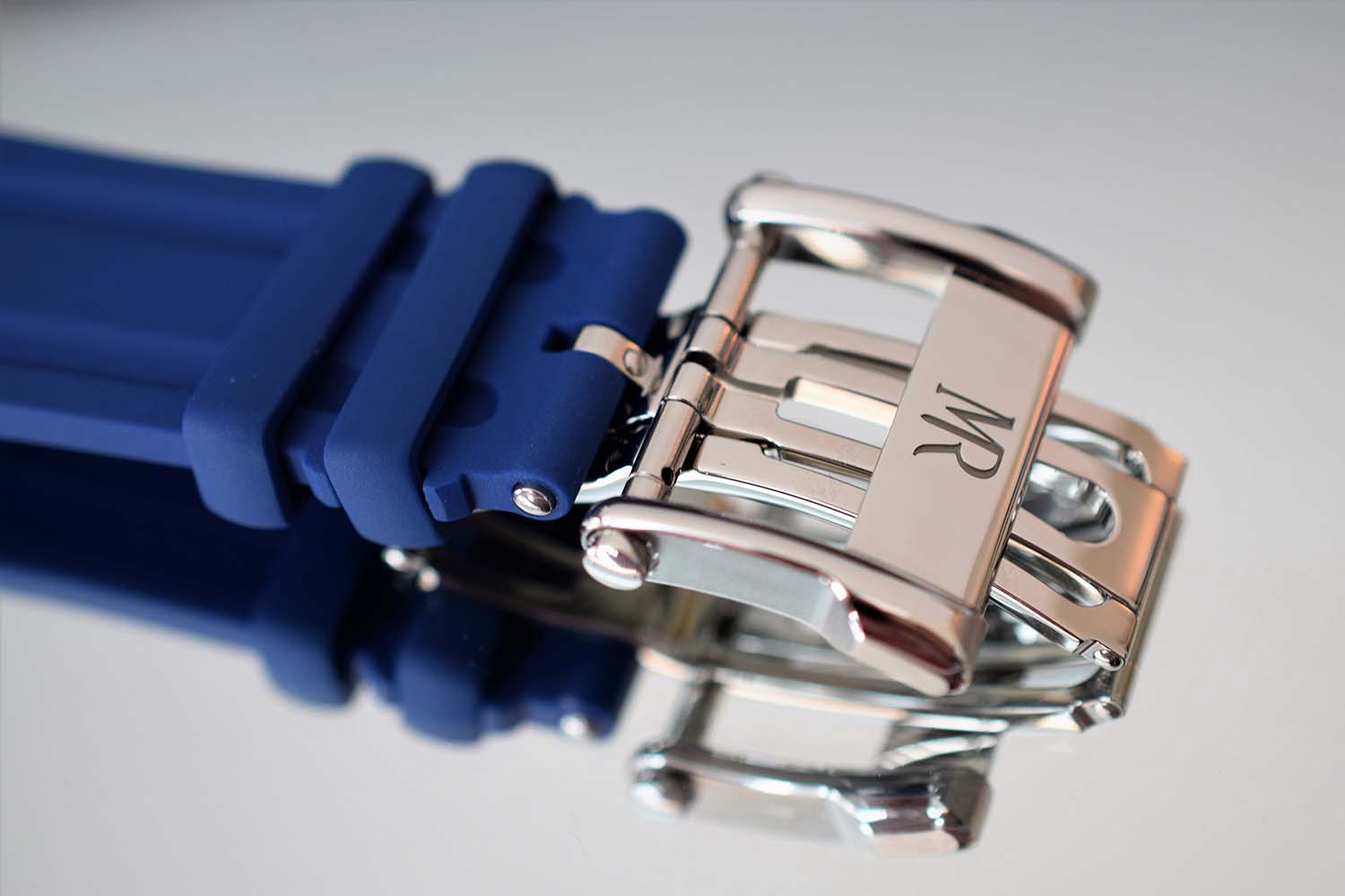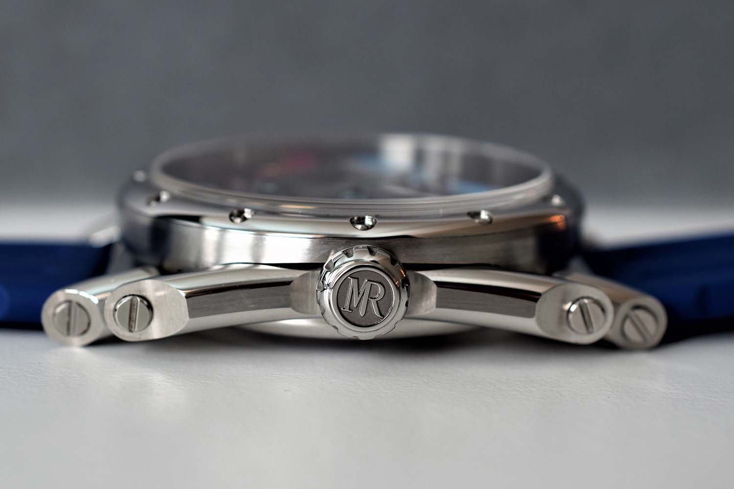 The MR10 movement is housed in the ADN case (read our article about the Manufacture Royale ADN from Baselworld 2017 here). Crafted in steel, this bold case construction is 46 mm in diameter and comprises no fewer than 67 components. The bezel is held in place by 6 screws, and mobile lugs pivot between brancards (which hug the side of the case) resulting in improved ergonomics. This way it folds around the wrist, and despite the impressive dimensions, it can be worn by men and even women with a smaller wrists and still be very comfortable.