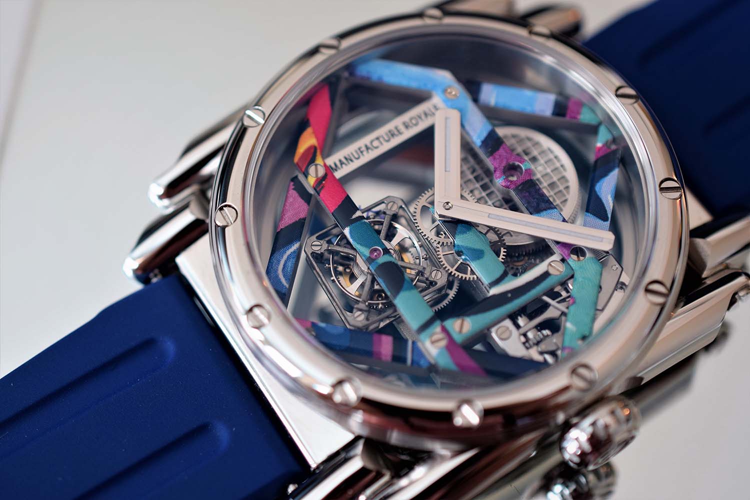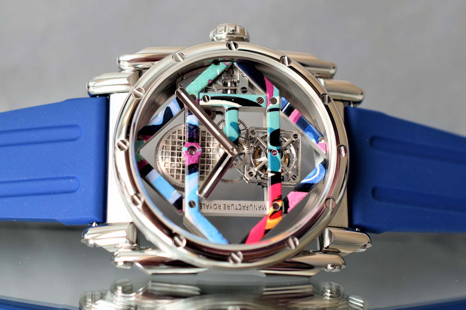 The Manufacture Royale ADN (DNA in French) Street Art Collection is an evolving spatial architecture. The structure of its movement is based on overlapping squares, now enlivened by striking colors. This angular, colored, external skeleton, frames the parts of the movement underlining the symmetry of the barrel and tourbillon cage at 6 o’clock. This modern construction is animated by the ballet of a one-minute tourbillon whose cage is unusually square.