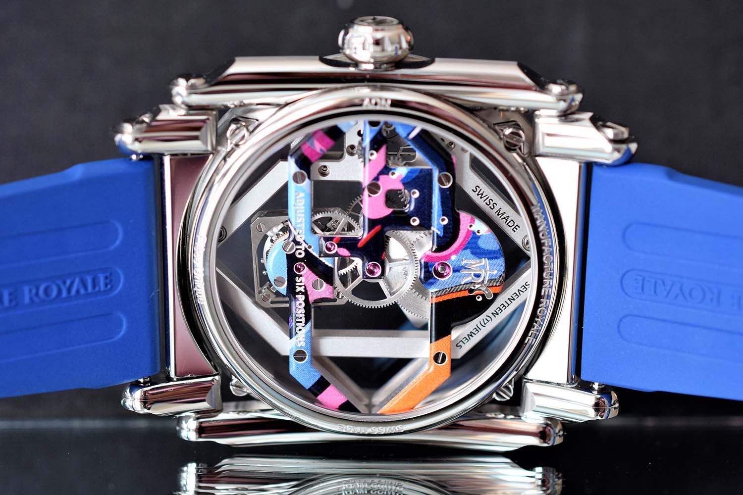 Powering the Manufacture Royale Street Art is the caliber MR10 manufactured in Vallorbe, where the brand is headquartered. This 36mm, manually wound movement, is the tenth from the brand. The balance vibrates at 3 Hz and the balance wheel features adjustment screws. The regulating organ is a one-minute tourbillon, with a rather unusual but very befitting, square cage. The main spring holds enough energy for 108 hours of autonomy. The barrel that houses the main spring, located at 12 o’clock, has a skeletonized cover with a grid pattern.