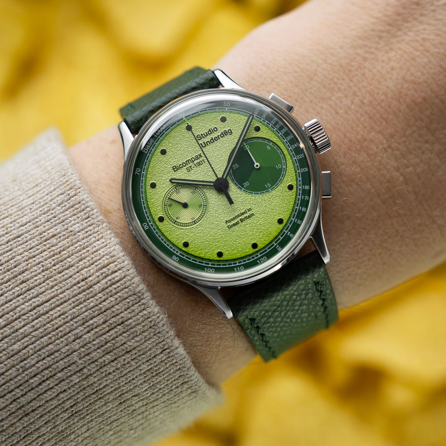 Following the discovery of a copy of the Watermel0n model in January 2024, Studio Underd0g enthusiasts began sending tips and updates about more copies. In lieu of taking legal action, founder Richard Benc decided to show a little humour and recreate the “Avocado Color” watch they found from brand copycat Proxima. This new Limited Edition Av0cado joins a second Guacam0le model in the spirit of good fun. The stainless steel cases are 38.5mm in diameter and 12.9mm in height (44.5mm lug-to-lug), so very wearable for a wide audience. There’s a double-domed sapphire crystal and flat exhibition case back, along with 50 metres of water resistance. No corners have been cut here. These are also bicompax chronographs, so you’ll find familiar flat pushers at 2 and 4 o’clock flanking the crown.