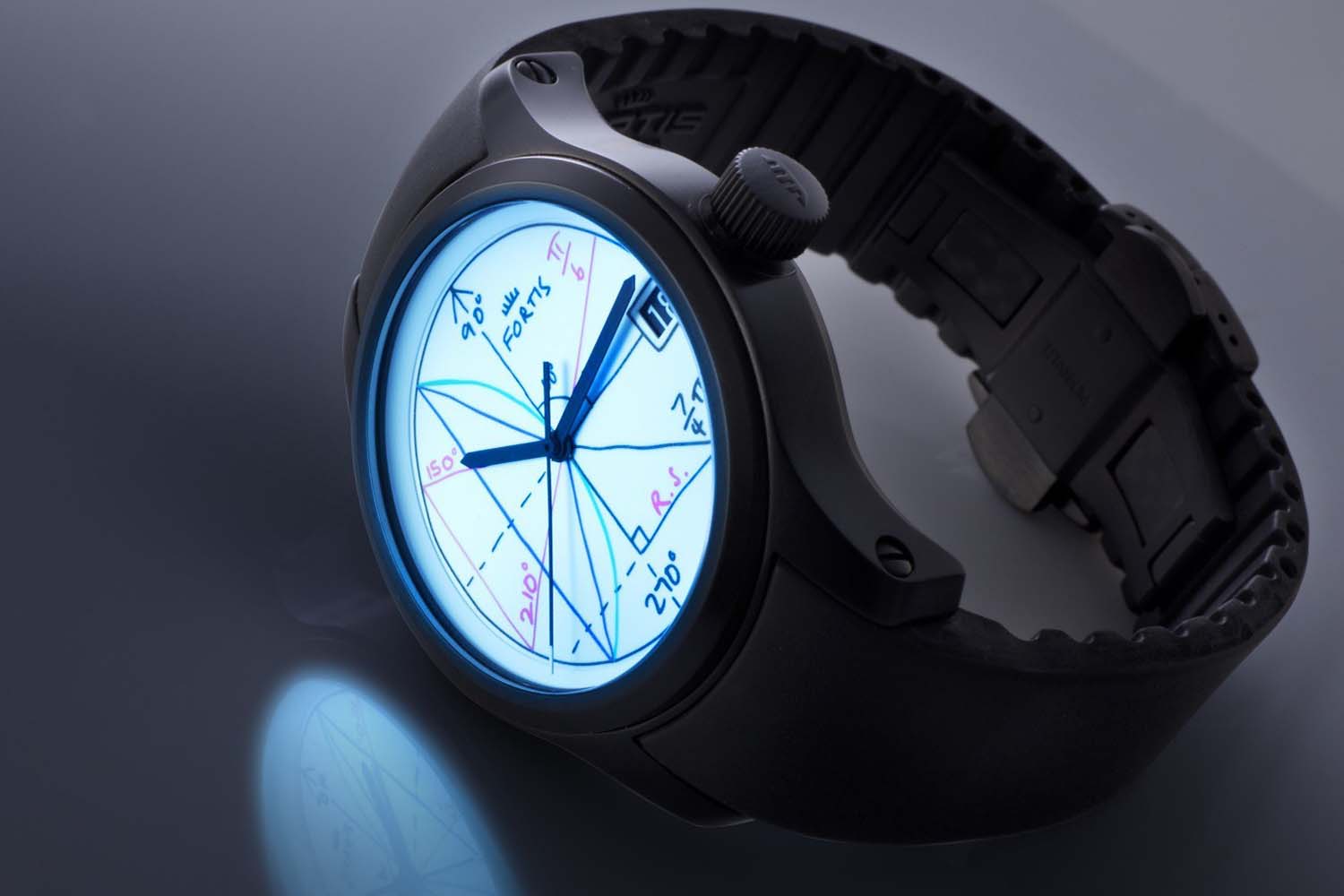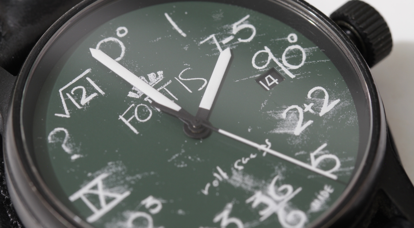 The Fortis Rolf Sachs 2.4ml L.E. is the fourth collaboration between Rolf Sachs and the Grenchen, Switzerland based brand, which has a history of creating art-pieces, like this Stratoliner Chronograph. The three previous versions in collaboration with Rolf Sachs are the 2?, the IQ and the ‘Frisson’. The 2? featured a whiteboard like dial, fully luminous by the way, with geometric markings on it in red/green/blue/black. The coolest bit? The scribbled on logo and name. The IQ watch has a chalkboard like dial with mathematical equations as hour markers, complete with traces of a chalky eraser. The ‘Frisson’ was inspired by Vodka and features a frosted glass, partly obscuring the dial. Wiping the glass with a wet finger or breathing upon it provides clarity and enables you to read the time.