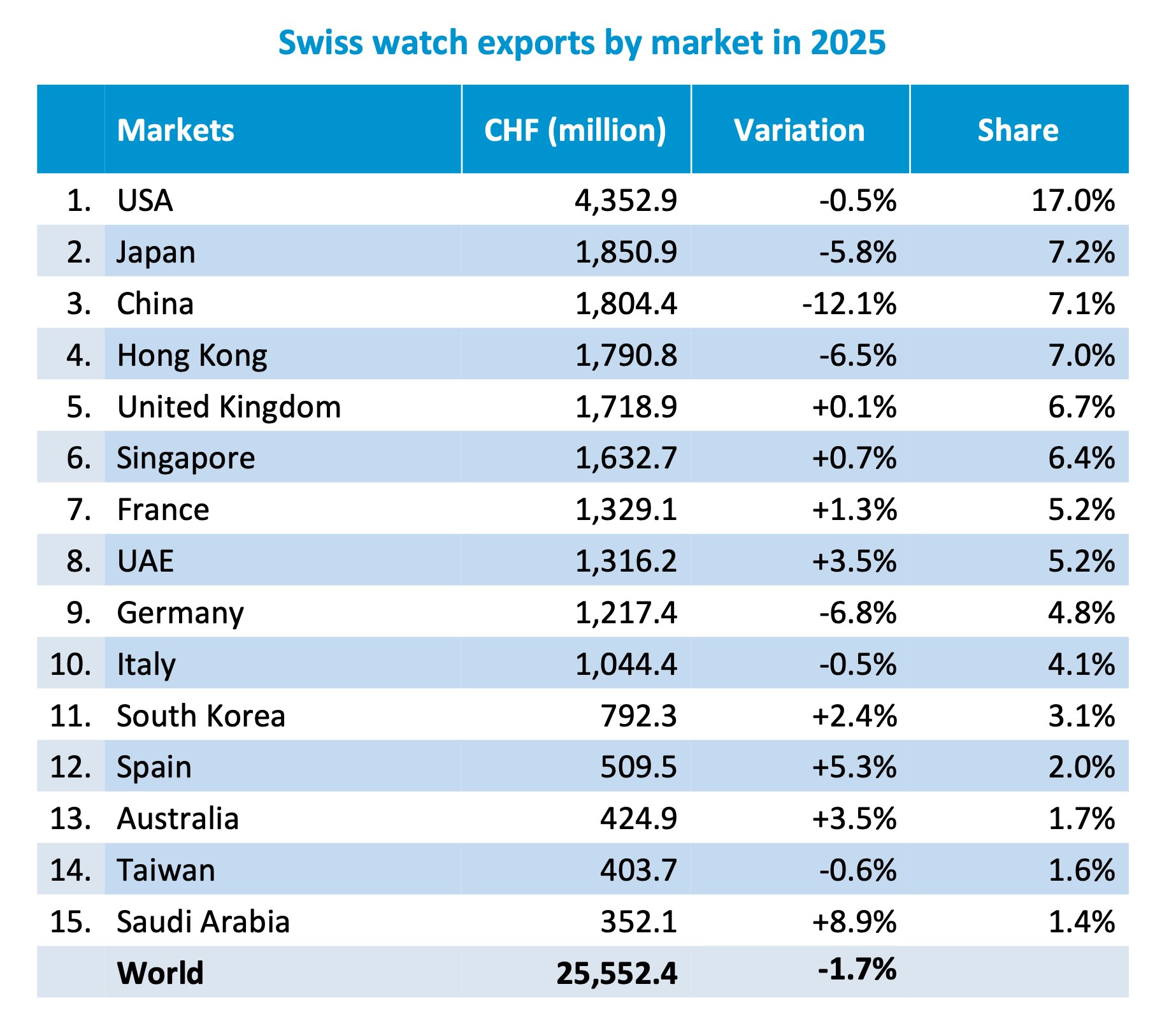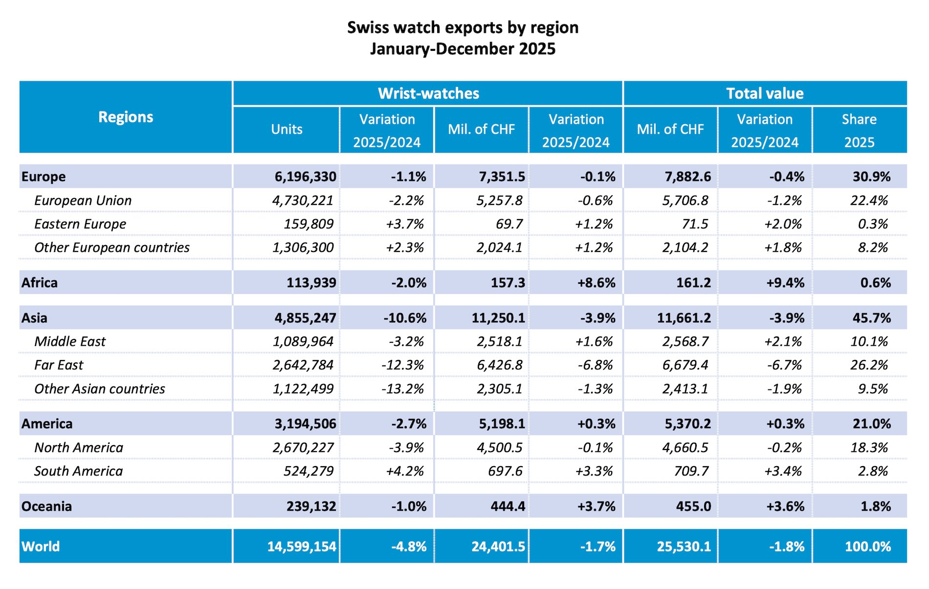 Swiss watch export figures for 2025 provide an official and reliable indicator of industry trends, but they do not fully reflect actual sales, as they measure shipments rather than end-consumer purchases. This distinction is particularly relevant this year, as the evolution of U.S. tariffs led brands to accelerate shipments to the U.S. ahead of the duty increase. For reference, Richemont’s 9-month sales (3rd quarter ended in December 2026) are up 5% and up 1% for the Group Specialist Watchmakers at actual rates. LVMH just announced an organic growth of 3% for its Watches and Jewelry division.