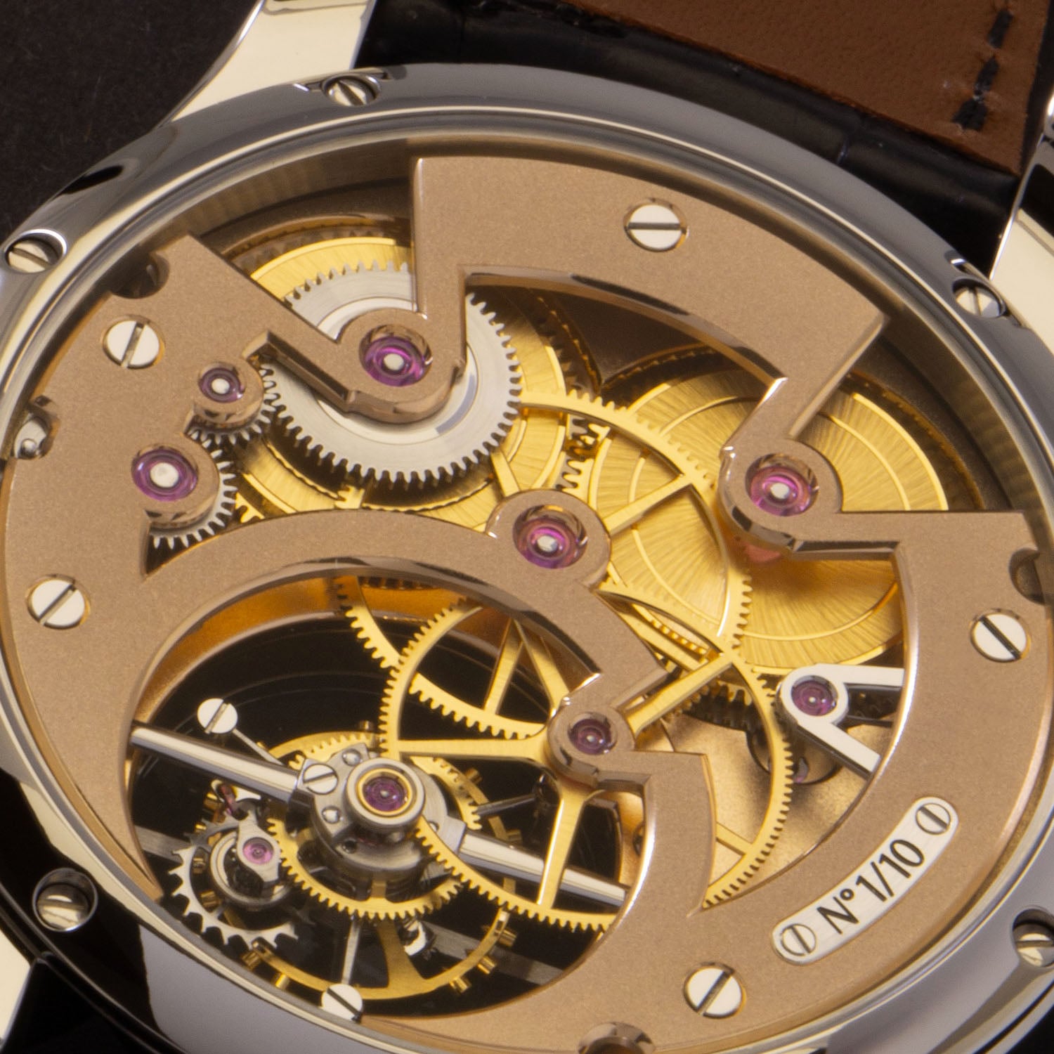 The Sylvain Pinaud Tourbillon is initially offered in three limited series of ten pieces each. One titanium version features a full titanium movement, lending a more contemporary and technical character. The other two are crafted in platinum with a maillechort (German silver) movement, except for the beautifully executed gold barrel bridge on the reverse side. Price is set at CHF 180,000 (excl. taxes).
