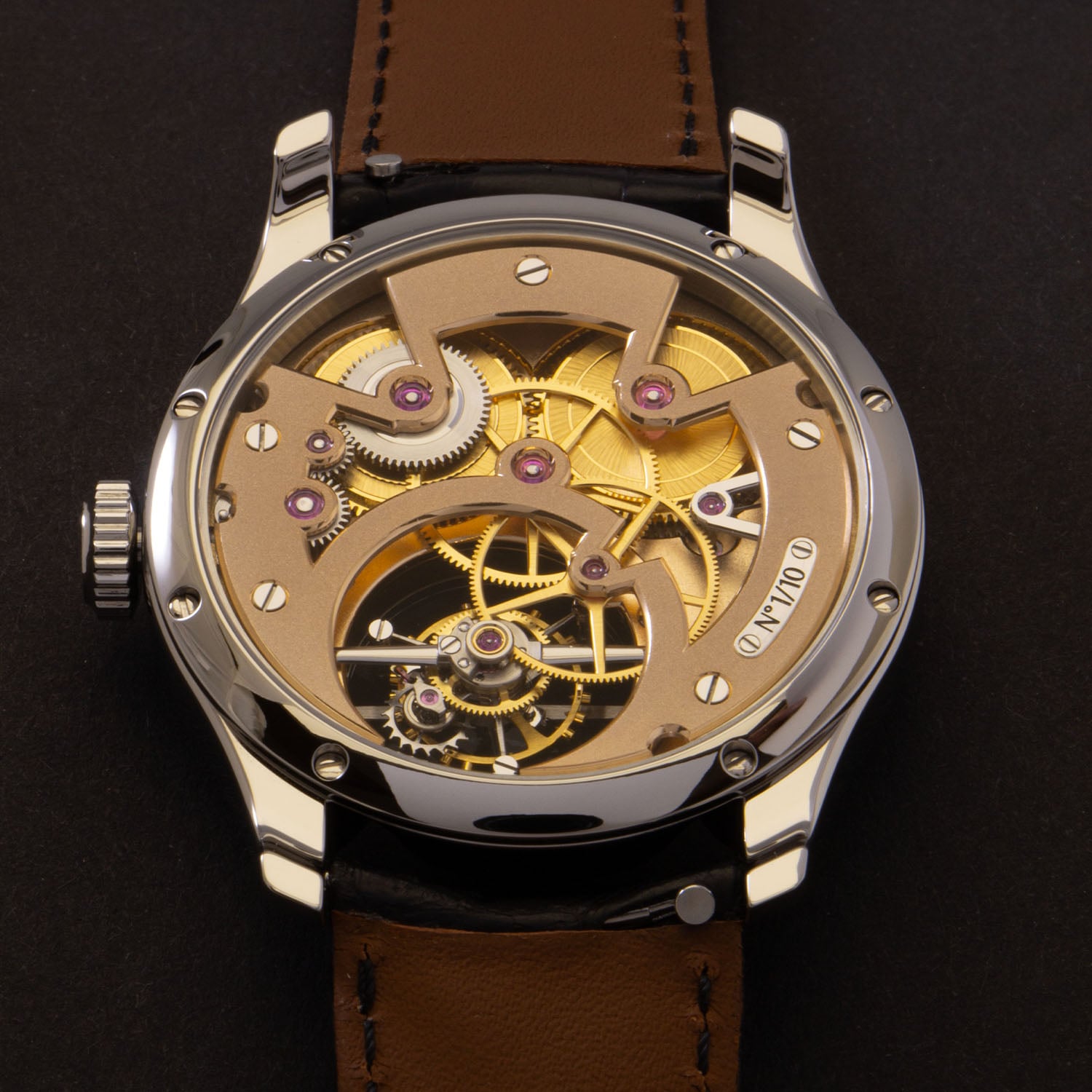 The Sylvain Pinaud Tourbillon is initially offered in three limited series of ten pieces each. One titanium version features a full titanium movement, lending a more contemporary and technical character. The other two are crafted in platinum with a maillechort (German silver) movement, except for the beautifully executed gold barrel bridge on the reverse side. Price is set at CHF 180,000 (excl. taxes).