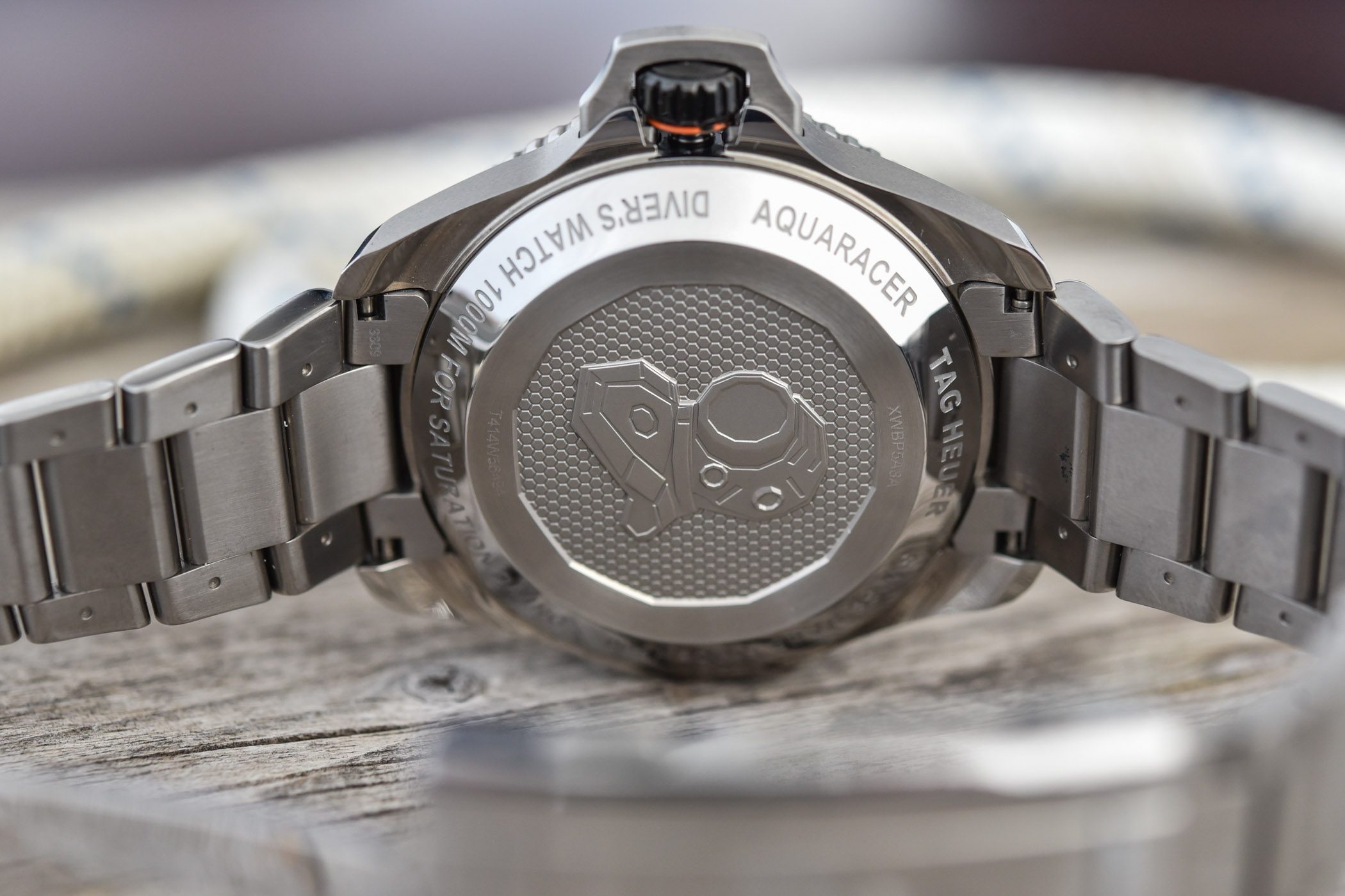 A rectangular steel helium escape valve at 9 o’clock also has a black DLC coating and “He” engraved, which is helium’s symbol on the periodic table. The steel caseback has the familiar vintage dive helmet engraving that’s seen on current Aquaracer models. The watch has an ISO 6425:2018 certification for saturation divers (thus compliant with the latest update) and water-resistance is again rated at 1,000 metres. It’s fitted with a 3-link titanium bracelet with a double safety clasp and fine adjustment system.