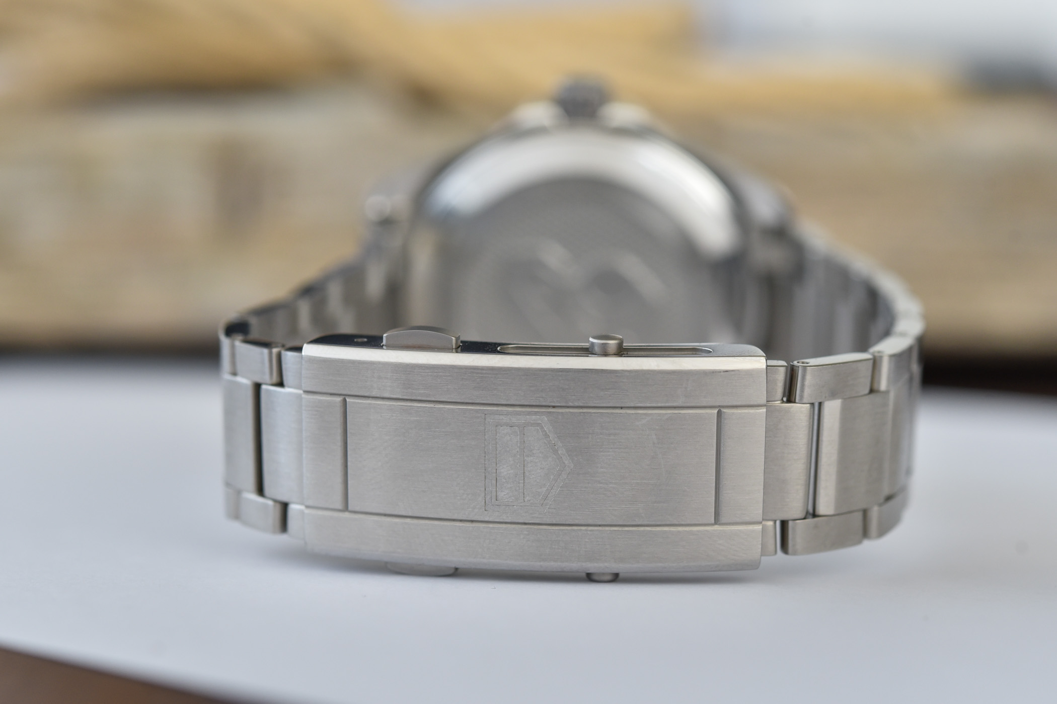 The stainless steel case is brushed and polished with a 43mm diameter. The 12-sided unidirectional rotating bezel has a black ceramic insert with contrasting white 60-minute Arabic numerals/marks and a detailed 15-minute scale. The triangular marker has Super-LumiNova with a blue glow. The signed crown screws down and is partially guarded by integrated case extensions, and water resistance is rated at 300 metres. A flat sapphire crystal with double anti-reflective coatings protects the dial, while a solid case back is engraved with a vintage diver’s helmet against a honeycomb pattern. The watch is fitted with a steel three-link bracelet with a double safety push-button clasp and fine adjustment system that increases by 1.5cm.