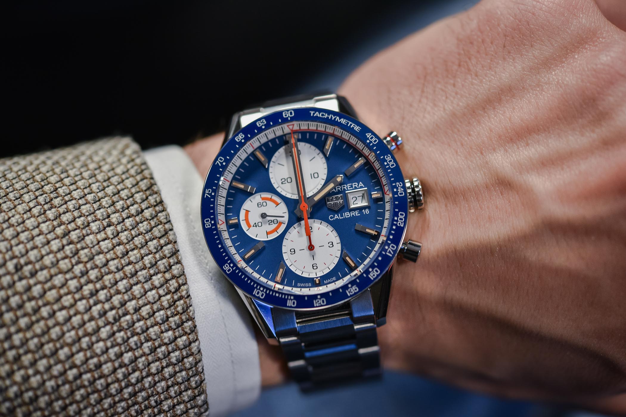 The three sub-dials, arranged at 12-6-9 are white and snailed and the chronograph hands are picked out in a bright lacquered red colour. Although there have been some objections about the use of the vintage-style lume on the hands and hour markers, I think it is a cool touch and looks very much like the treatment given to the hands and markers of a 1962 Autavia. In fact, the combination of the beige lume with the orange markings on the small seconds dial at 9 o’clock of the blue model reminds me of the Gulf livery emblazoned on the Monaco Gulf Special Edition 50th anniversary watch. I also like the way the facetted hour blocks have been hewn at sharp angles or reduced to a tiny base to accommodate the counters and the date window.