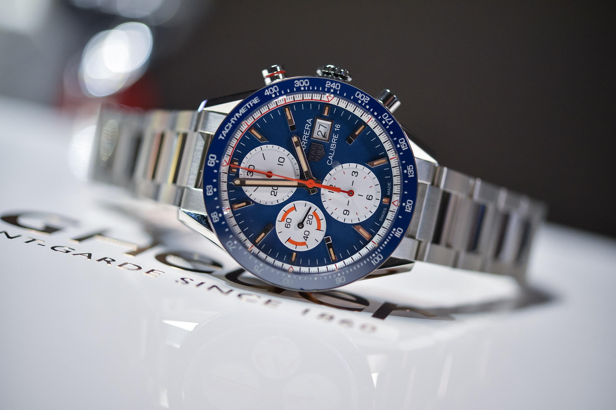 To measure the lap speed of your favourite team on the race track, the TAG Heuer Carrera Calibre 16 Chronograph watches are fitted with a tachymeter scale. Both models come in 41mm steel cases with water-resistance of 100 metres and feature either a black or blue ceramic bezel with a tachymeter scale with white markings. The case, the pushers and the crown are polished and contrast, in the case of the model with the blue dial, with the brushed finish on the bracelet. A welcome nod to the past is the use of the interior bevel to display the 60-second scale, a feature that Jack Heuer invented in the 1960s to keep the dial of his Carrera as clean as possible. The white flange features black and red markers for heightened legibility.