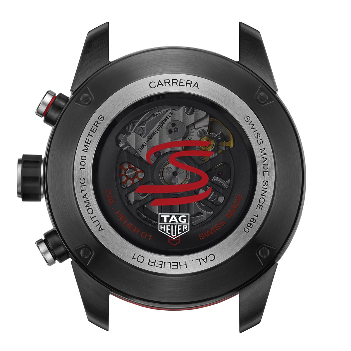The sapphire case back is tinted and bears the Senna and TAG Heuer logo. It allows viewing of the in-house Heuer 01 automatic column wheel chronograph movement. This 13’’’ caliber ticks at 4 Hz. for a power reserve of 50 hours. The shape of the rotor is reminiscent of a steering wheel. The column-wheel is red.