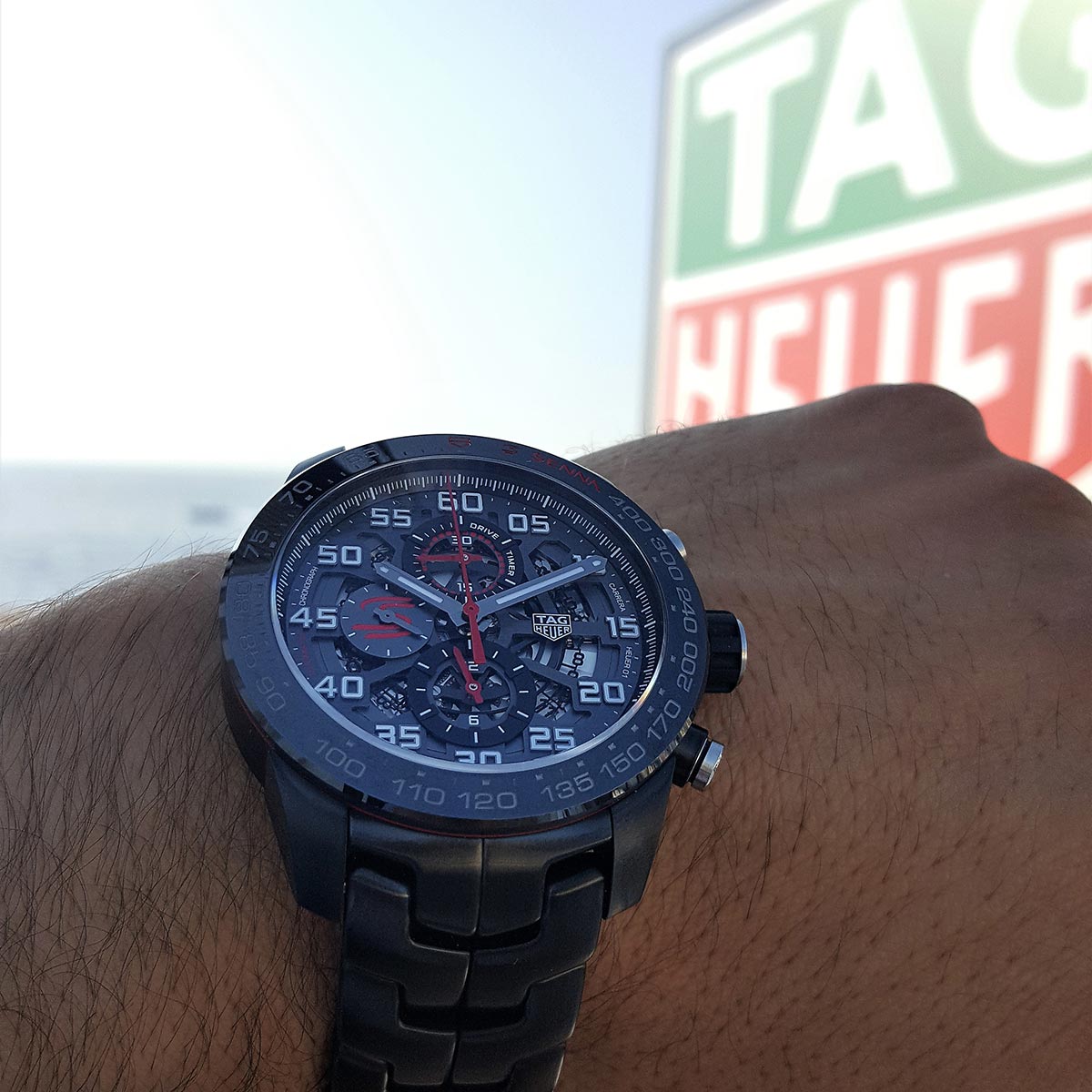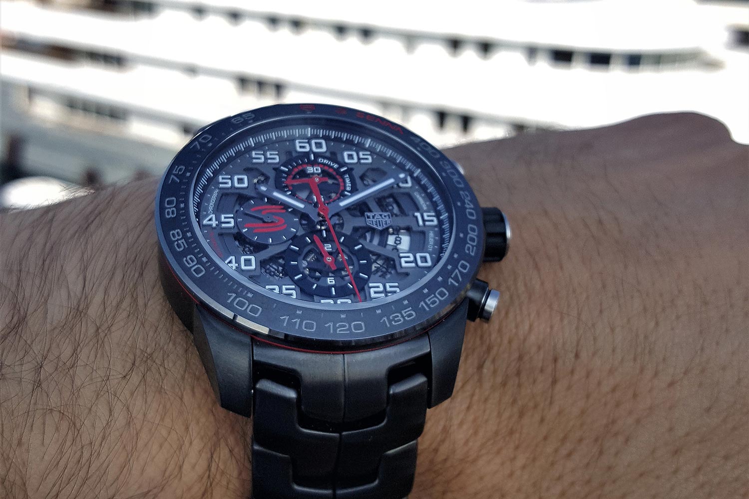 The TAG Heuer Carrera Heuer01 SENNA 2017 edition is worn on the signature S-shaped link bracelet. I am usually not a fan of the ‘link’ bracelet but I think it works very well here with the black finish and automotive background. In addition, it is particularly relevant as it was worn by Senna himself.