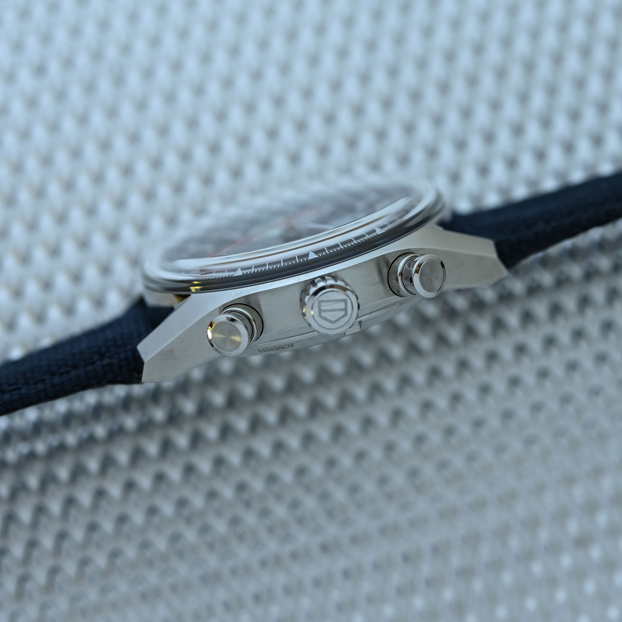 The rest of the case used for this new TAG Heuer Carrera Skipper is fully identical to the classic reversed panda or blue Glassbox chronographs. As such, it retains its comfortable 100m water-resistance (useful for a yachting watch) as well as its relatively compact proportions. If the height is measured at about 14mm (manageable for a modern automatic chronograph), the 39mm diameter and restrained 46mm lug-to-lug make this watch very comfortable on the wrist. The sharp, faceted lugs and oversized pump-like pushers are reminders that this watch is, first and foremost, a Carrera.