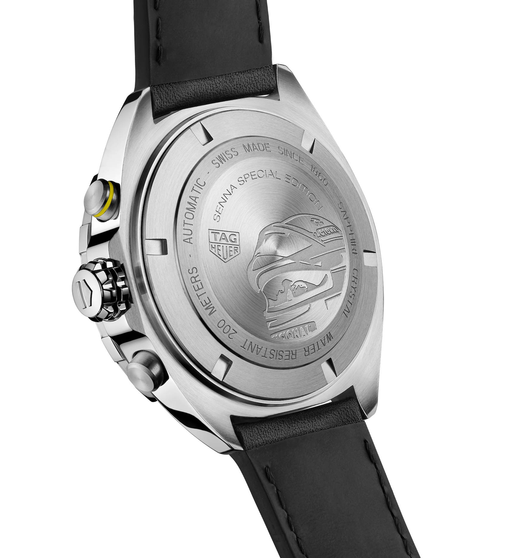 Inside the stainless steel case, the TAG Heuer Formula 1 Senna Special Edition 2020 automatic watch – priced at EUR 2,900 – is the calibre 16 movement. Also known as the ETA 7750, this reliable calibre is widely used. It provides a 42-hour power reserve and a performance of 28,800 vibrations per hour. Utilised in IWC, Hublot and Panerai watches, the movement easily meets the requirements of COSC certification and is concealed behind a specially engraved 200m water-resistant steel caseback.