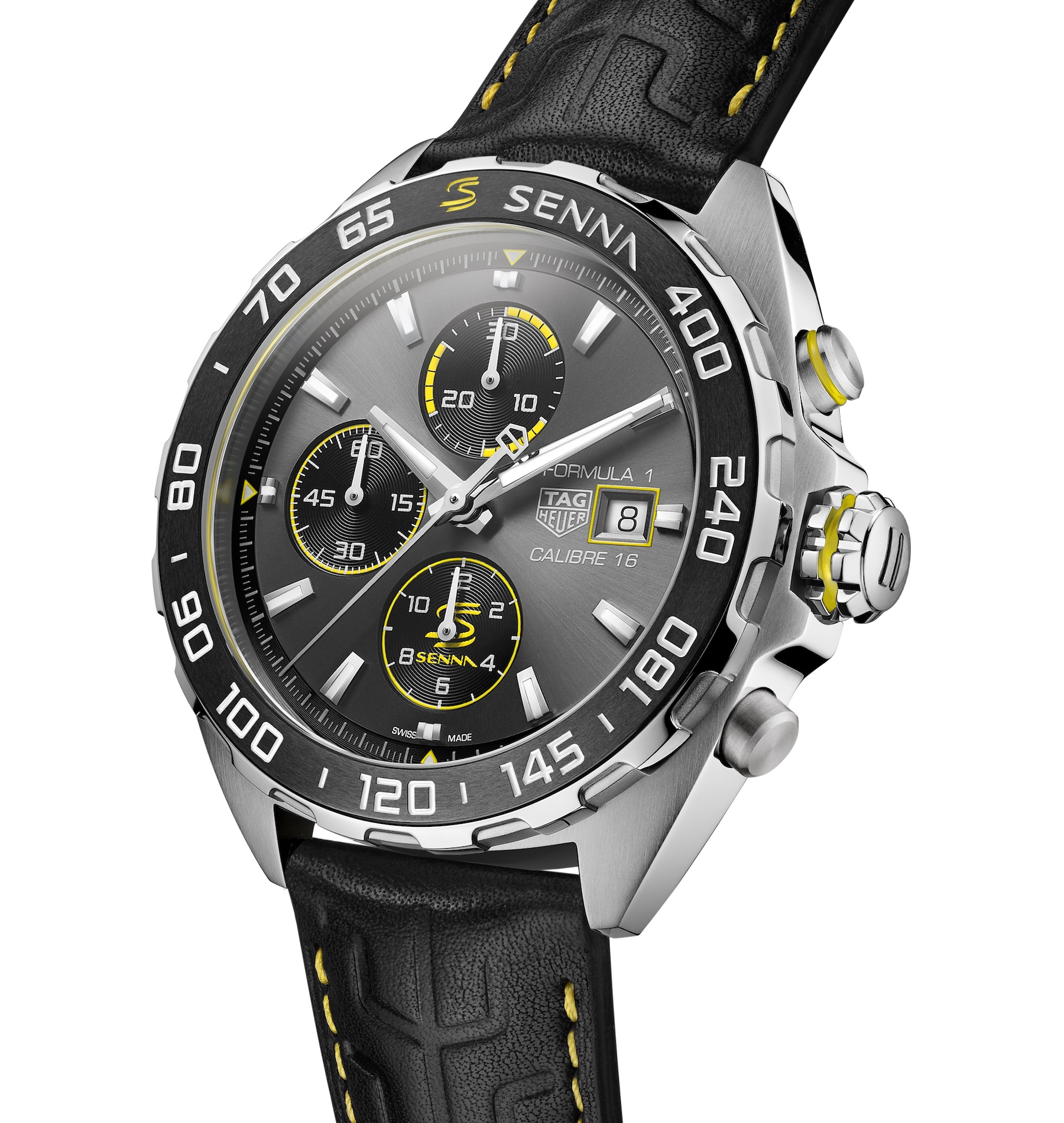 The TAG Heuer Formula 1 Senna Special Edition 2020 automatic watch features an anthracite dial in a sunray-brushed finish with rhodium-coated, Super-Luminova treated indices and hands for easy timekeeping in dark conditions. Black chronograph sub-dials at 12, 6 and 9 o’clock are finished in an “azurage” effect, providing chronograph minutes, hours and permanent seconds respectively. Yellow accents are designed to enhance legibility and can be found detailing the date, push-pieces, chronograph dials, strap stitching and the bezel markings. As seen in previous TAG Heuer Formula 1 Senna watches, the stylised “S” motif can be seen inside the 6 o’clock sub-counter and the embossed “S”-shaped pattern embossed into the watch’s black calfskin leather strap. The band is completed with a folding clasp, a double safety mechanism and a pilot extension feature that enables the watch to be worn over the top of a thick driving suit.
