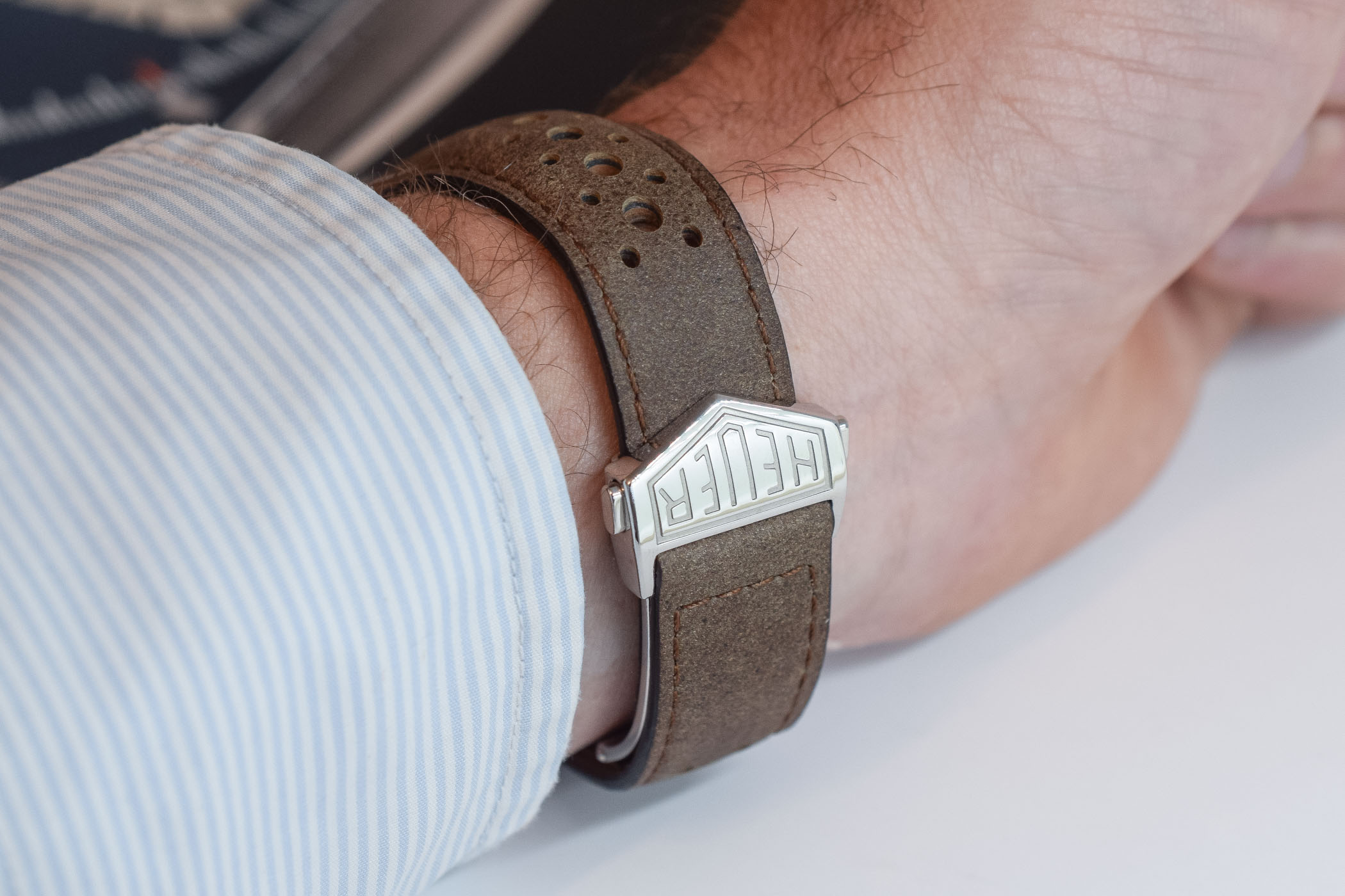 This limited edition of just 169 pieces (yes, you’ll have to step on the gas if you want one!) stands out with its green dial with brown and yellow accents and a Geneva-stripe pattern. The facetted hour markers and square registers are presented in the traditional Monaco style, meaning sharply defined and horizontally positioned. The facetted hours and minutes hands are inlaid with luminescent material.