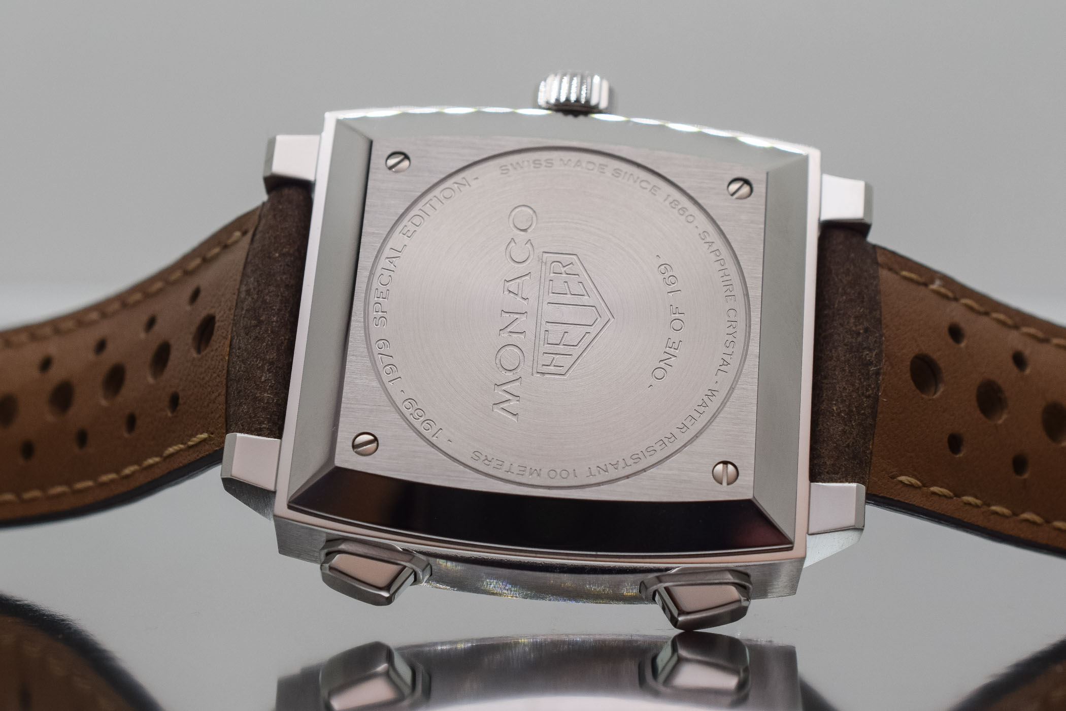 The square angular case is similar to recent Monaco watches, with its 39mm x 39mm proportions. This TAG Heuer Monaco 1969-1979 Limited Edition is made of stainless steel with alternating brushed and polished surfaces. The chronograph pushers are on the right of the case and the crown on the left. The box sapphire crystal is slightly raised. Secured by four screws, the full caseback is engraved with the original “Monaco Heuer” logo and the caption “1 out of 169”. Water-resistance is of 100m.