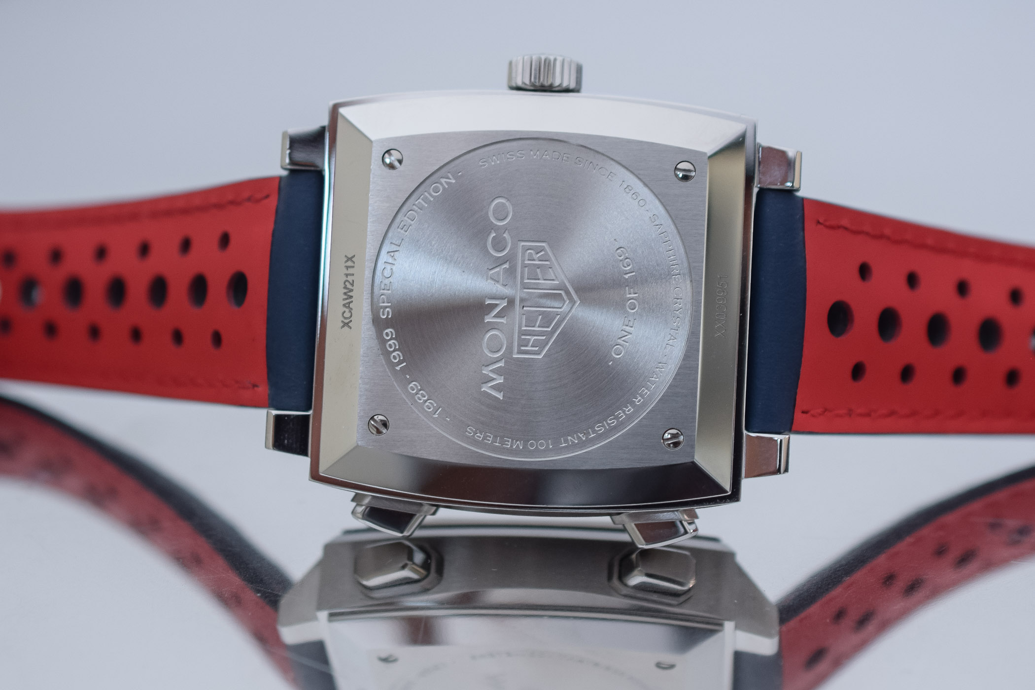 Inside the case is the modern TAG Heuer Calibre 11, a movement based on an automatic Sellita SW-300 with inverted Dubois-Depraz chronograph module, ticking at 4Hz and with a 40-hour power reserve. It is hidden behind a closed steel caseback with “1989-1999 Special Edition” and “One of 169” engravings.