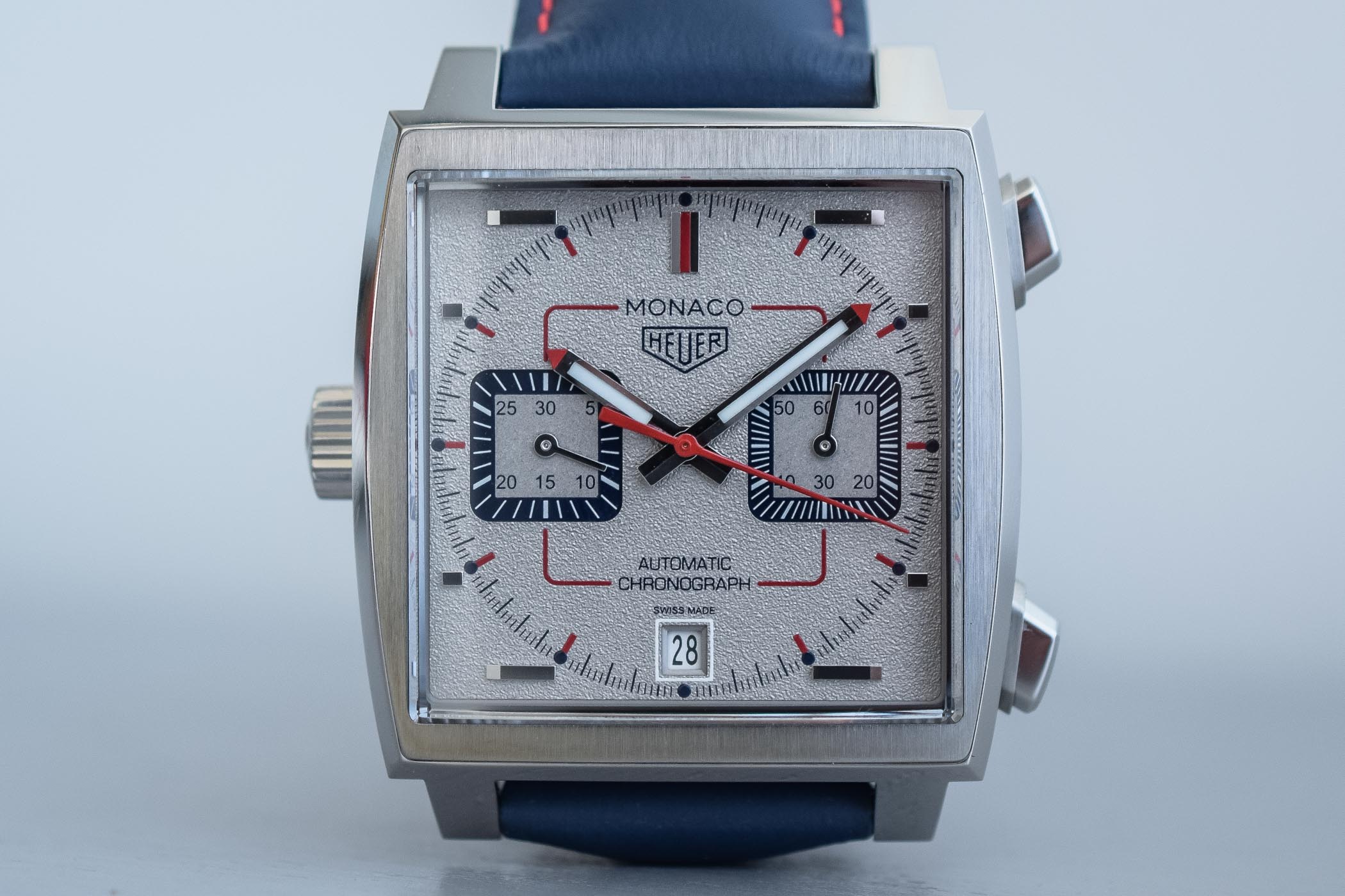 The base of the dial is deeply grained with a rhodium-plated surface, resulting in a metallic but matte colour. Hands and hour markers remain identical to the 2 previous watches and to the classic McQueen CAW211P. This means typical horizontal, polished, faceted applied indexes, and the “Monaco” hands filled with white Super-LumiNova. Several touches of red on the hands and markers bring the racing spirit.