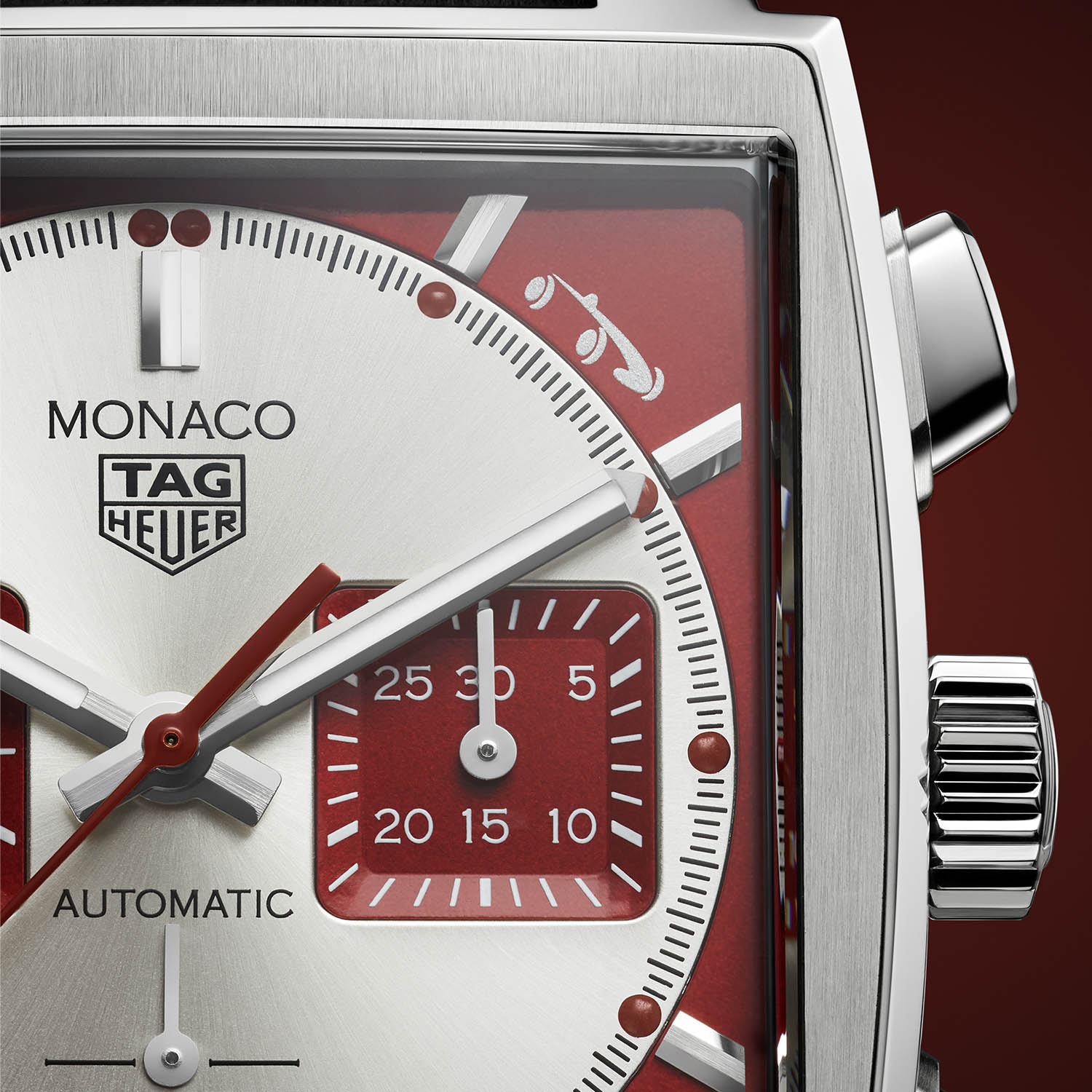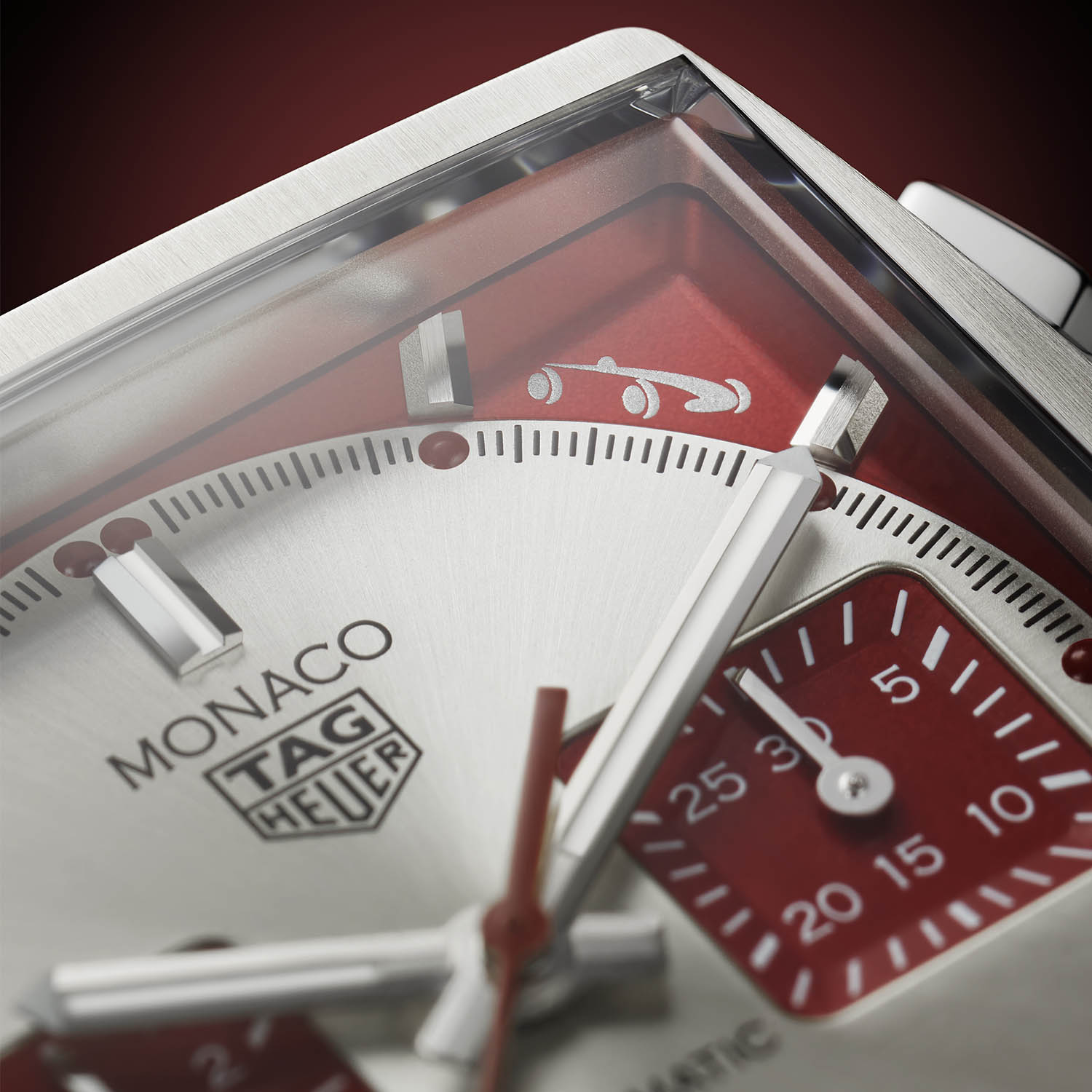 For this TAG Heuer Monaco Calibre 02 Grand Prix de Monaco Historique Edition CBL2114, the brand introduces new colours, with an unprecedented yet striking colour scheme. The dial, which features a combination of a round central part and radial indexes, is treated in silver (rhodium-plated) and red, over a sunray-brushed surface. The sub-counters for the chronograph – 30-minute and 12-hour – are slightly recessed and painted red too. This red colour is also found on the central chronograph hand and the dots that mark the hours. Unique for this edition, the small Grand Prix de Monaco Historique logo at 1 o’clock.