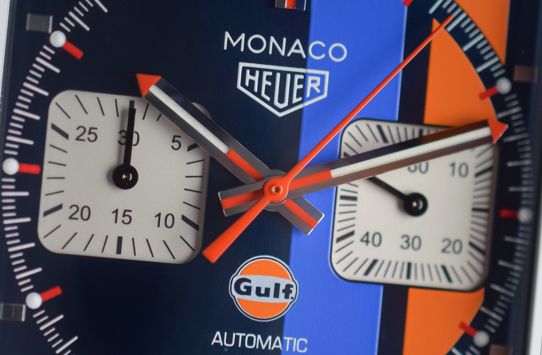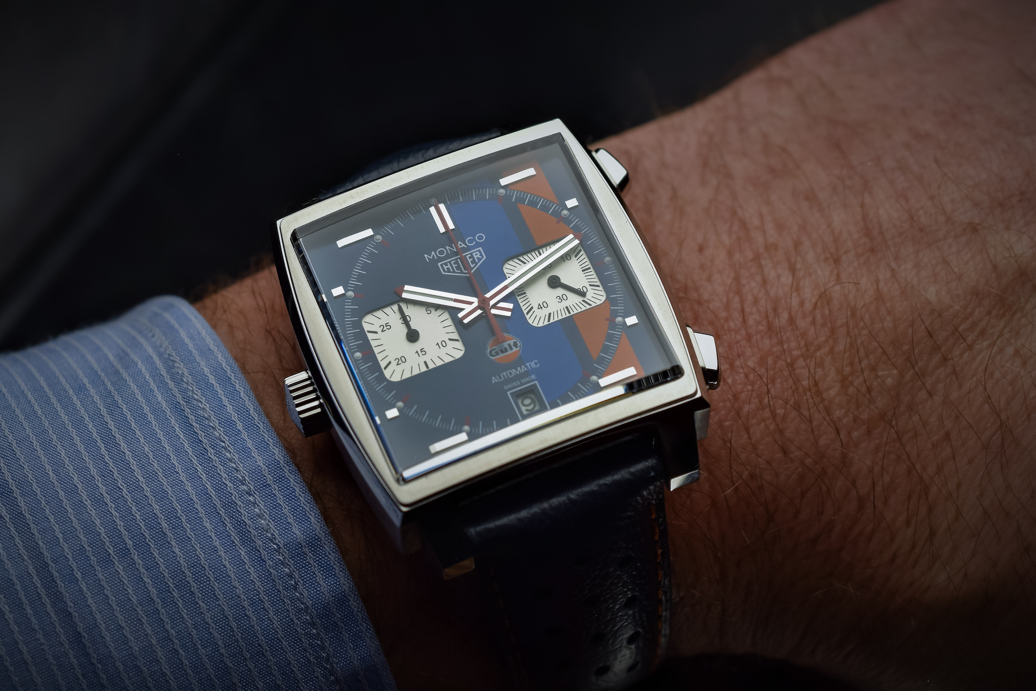 Right in the middle of the Geneva car show, TAG Heuer has announced a global partnership deal with Gulf Oil International, one of the most legendary sponsors of motorsports. So, what happens when a brand known for its racing-car roots teams up with one of the best-known players in the automotive industry? Well, the result is the immediately recognisable blue and orange stripes applied to one of the most iconic motorsports chronographs, the square-shaped Monaco. Please meet the TAG Heuer Monaco Gulf 2018 Special Edition.
