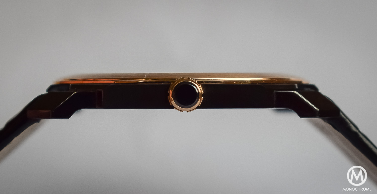 From a design standpoint, the finesse of the watch is really striking. Wearing it for some time was really quite an experience. The visual impression is enhanced by the black finish of the watch balanced by pink gold accents.