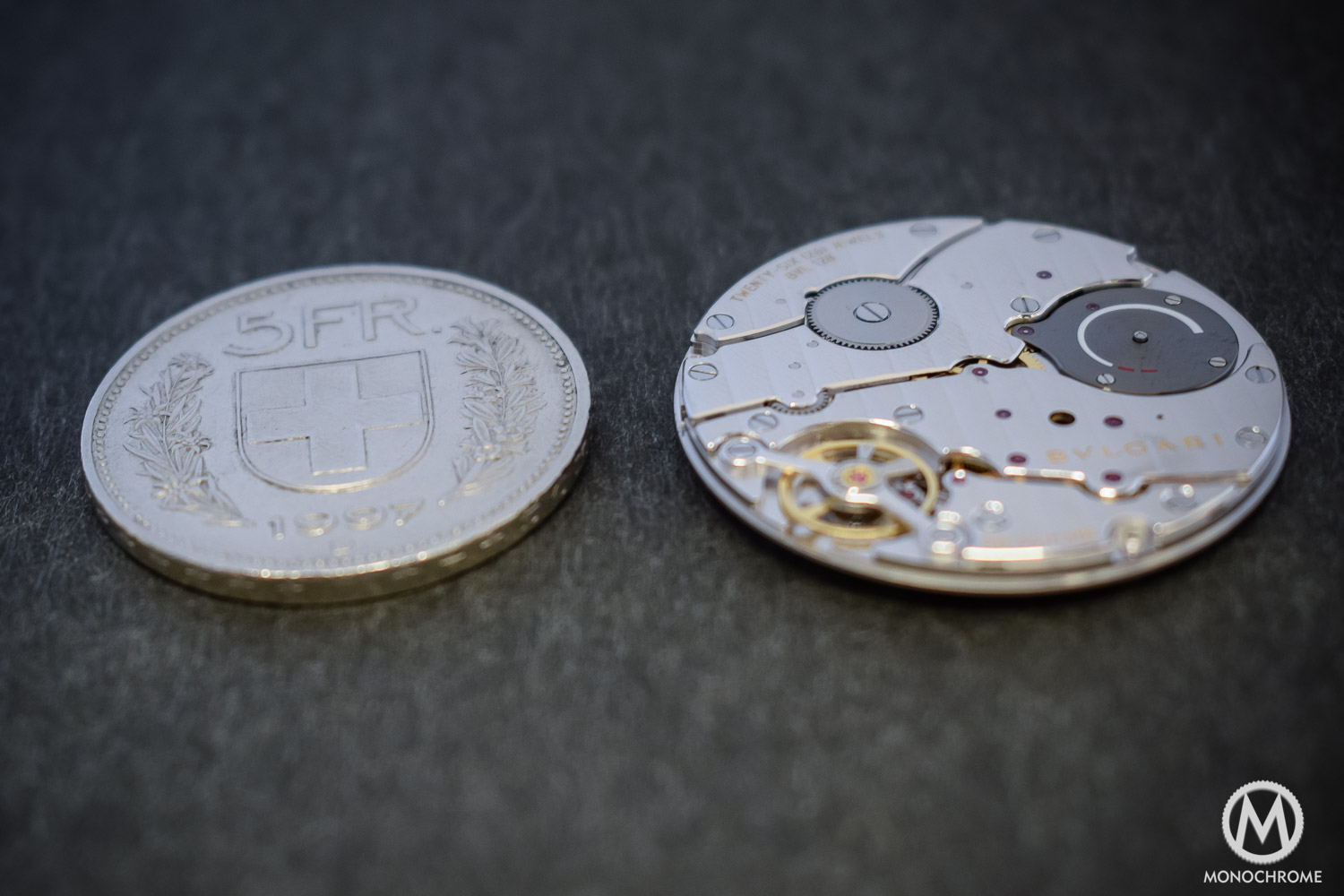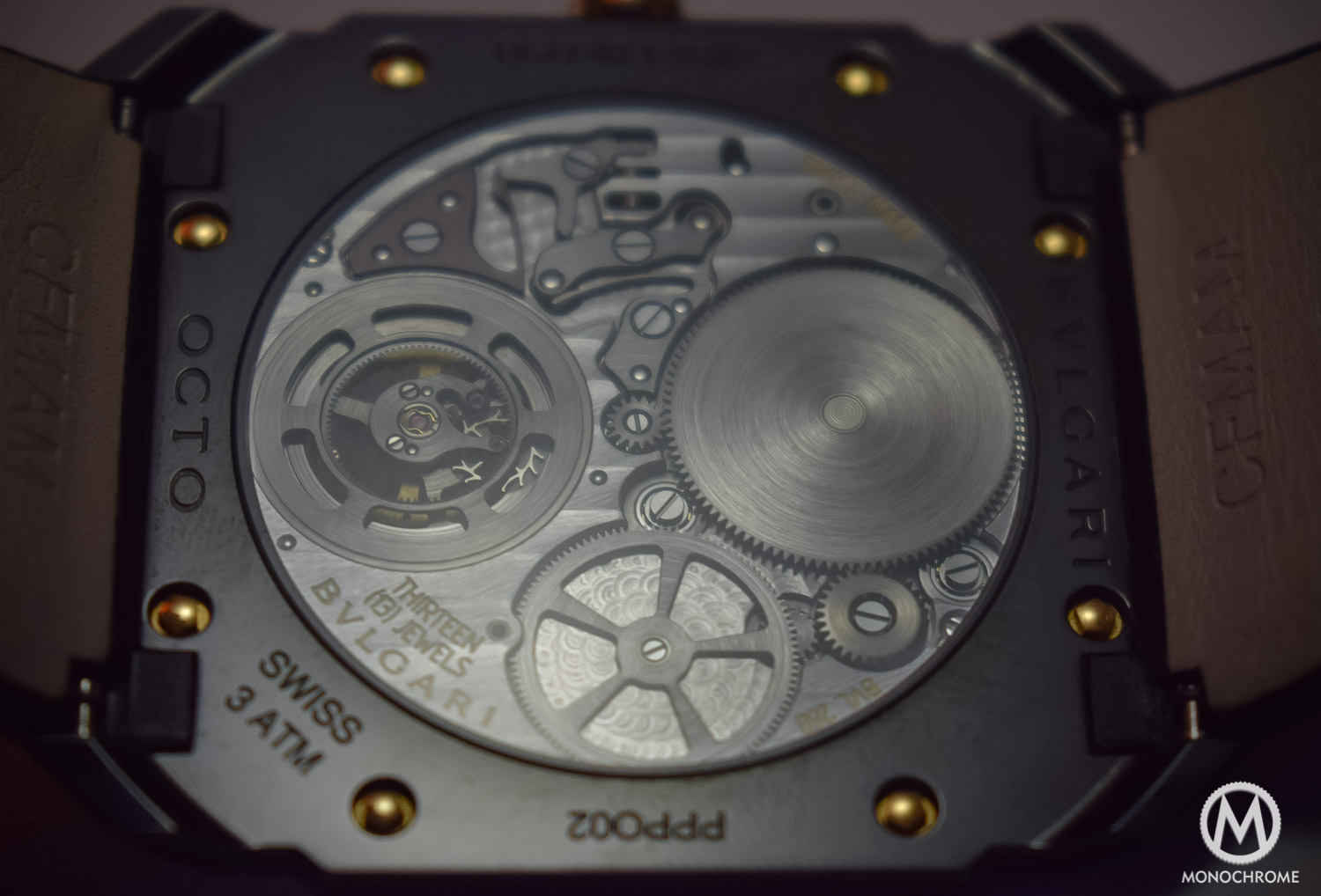 Powering the Octo Finissimo is the BLV 128 movement, developed and manufactured in Bulgari’s work shop in Le Sentier. The movement measures just 2.23 mm thick, an impressive feat that is further highlighted by the watch’s slender profile. What really strikes you though when you turn the watch over is the diameter of the movement. At 36.6mm it fills up much of the case. This large diameter means the the BLV 128 could be equipped with a big barrel which in turn means it offers an impressive – especially for such a flat movement – 65 hour power reserve. The decoration shows off large, beautiful Geneva stripes, nice anglage and snailing on the ratchet wheel. Its architecture features four large bridges, plus a thin full balance bridge.